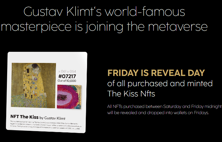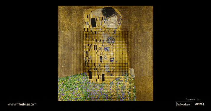这幅由 Gustav Klimt(古斯塔夫·克里姆特)所创作的世界名画被 Belvedere(奥地利丽城画廊)与 artèQ 看中并合作推出了相应的数字版,每一块 NFT 的单价预估在 1.850 欧元左右,而且他们还很有噱头的将发售时间定在情人节前,不得不说吸引力真的很大。