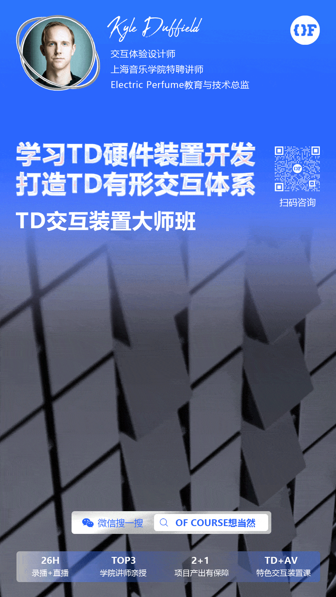 看完这么多博物馆联合 NFT 创作出的作品,你是否也想制作一个独一无二的 NFT 作品呢!这不 Of Course 联合了上海音乐学院特评讲师、Electric Perfume 教育艺术总监 Kyle Duffield 老师为大家带来了全新的 TD 交互装置大师班!