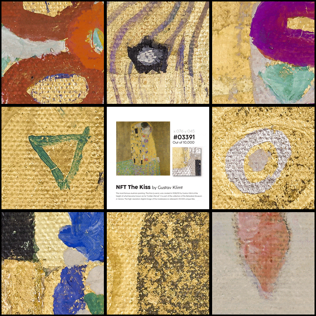 除了上面说的这件艺术品被制作成 NFT 碎片以外,还有一幅世界名画《The Kiss》也被分割成了一万份。