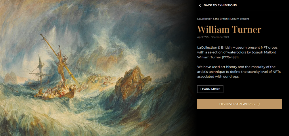 就如同这次,LaCollection 与大英博物馆合作的威廉特纳系列,很小众的使用了这位本土大师的早年创作历程,将他游历欧洲所记录的风景人文以 NFT 的形式供爱好者收藏。