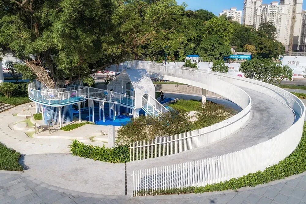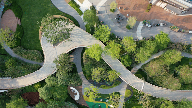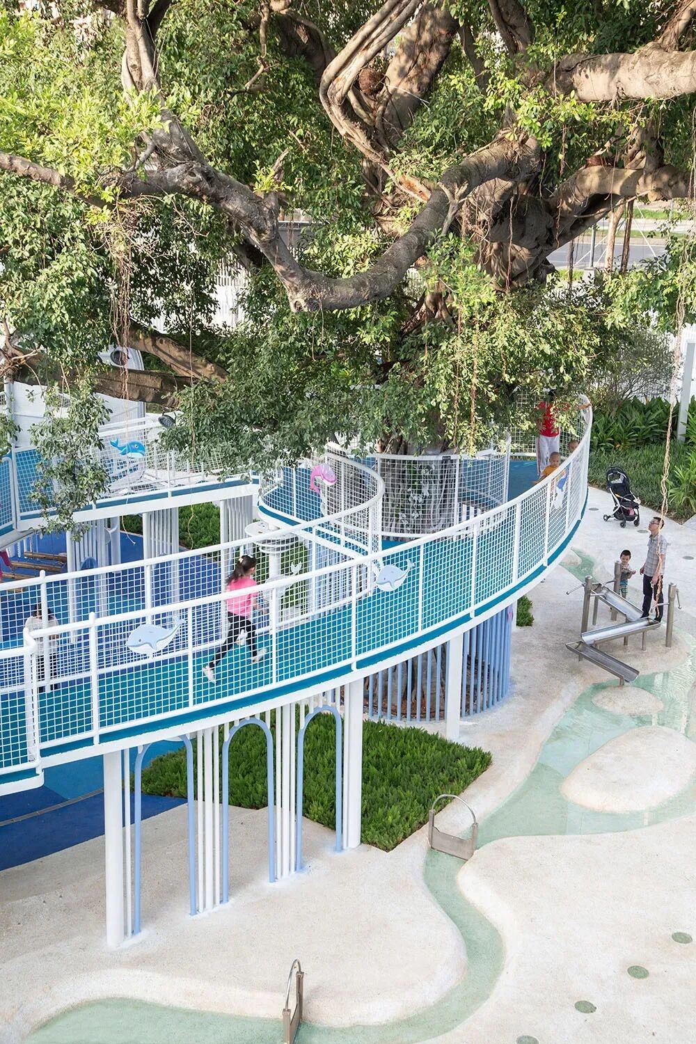 城市剧场设计围绕老树展开,构筑悬置空中的地景廊桥,廊桥与原有建筑户外平台相连接形成上下联通的步道,多向的空间流线增强了自由度与开放性,同时让空间更具新奇有趣的视觉感。