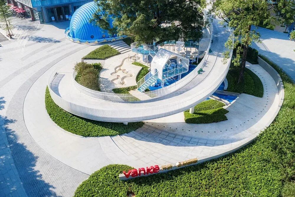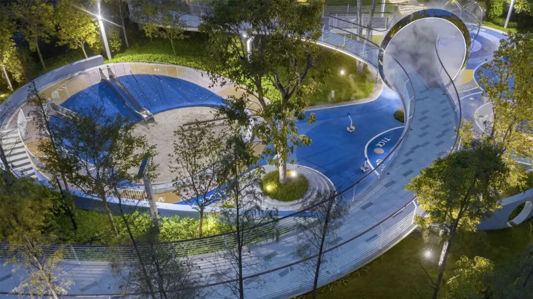 在这个五彩缤纷的星轨乐园里,永川万科城利用地形高差构筑起大大小小的儿童游乐设施,结合星光主题,场地以蓝色塑胶场地为基底,以“星际探索”为主线展开“太空遨游”的历险故事,星际穿越、星光轨道、虫洞历险,将星光廊桥与隧洞进行穿插,悄然构筑起一个立体式复合化的全龄儿童活动场景空间。