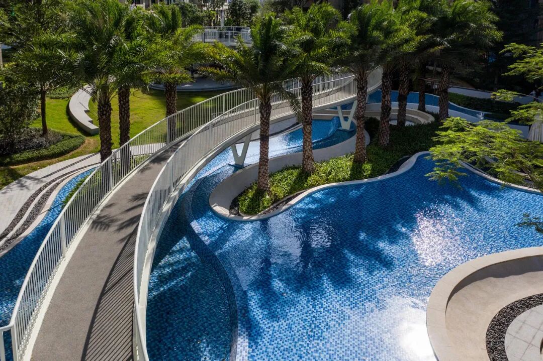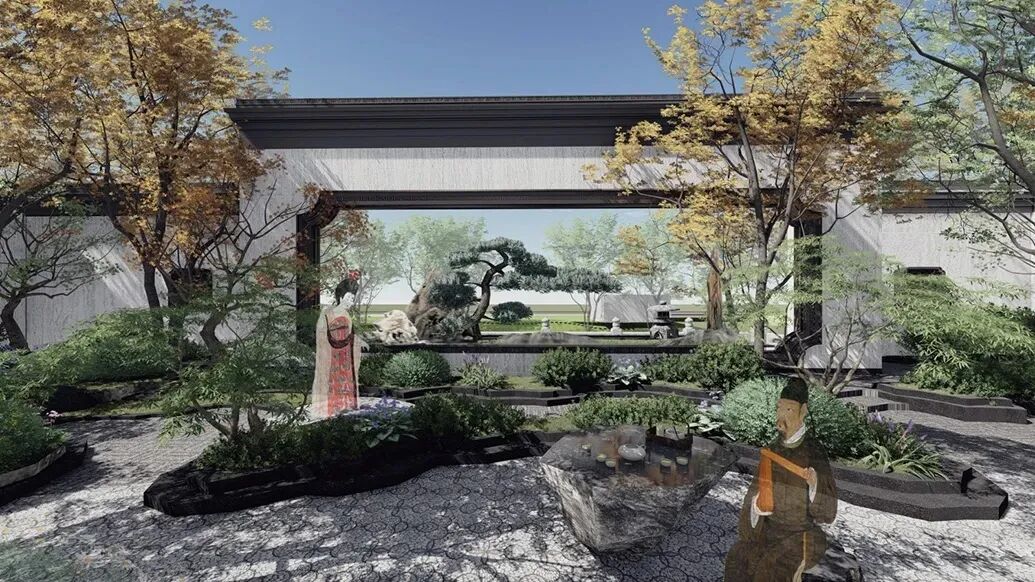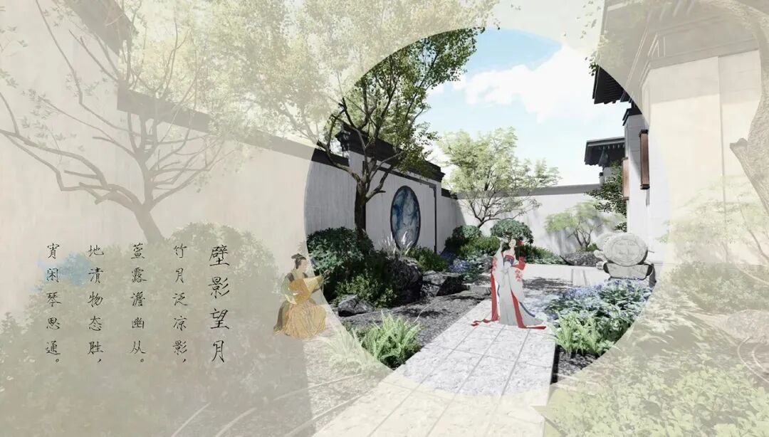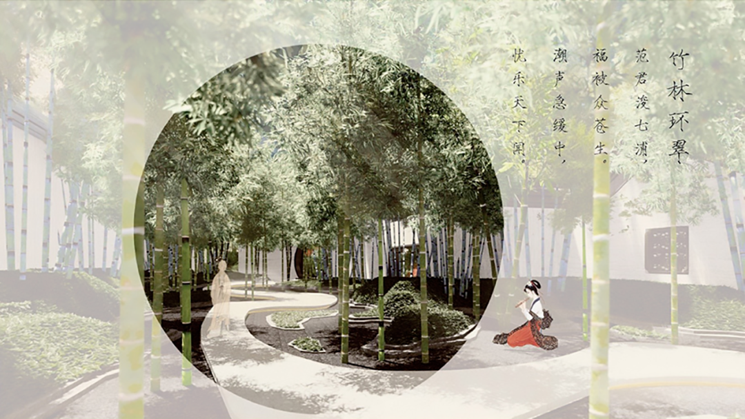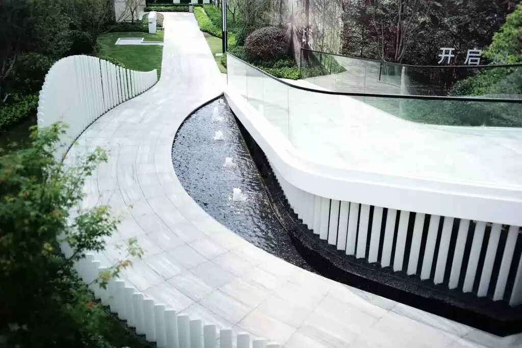 沙溪桥荷连接后期烟水晴岚区域,通过动线形成一个闭环,连接到售楼处空间,以静水、折桥、荷花组成整个空间的图志;通过传统元素-白墙黑瓦及新元素-仿古折桥集合及荷花点缀在水面上,在施工过程中考虑到荷花的生长周期及生长环境,选用了中式寓意的竹林作为背景植物空间。