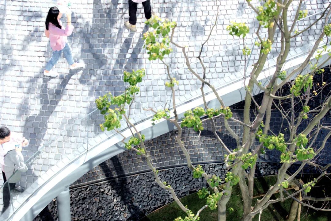 透明的玻璃栏杆消隐了人与树林间的阻隔。人们在廊桥上行走、停留,体验从树梢、林间、林端多维度的空间体验。
