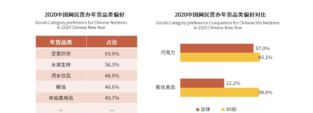 相关调查显示,年货品类偏好中分别有65.9%、56.3%和48.9%偏好坚果炒货、水果生鲜和酒水饮品,因此,年货消费可谓直接决定休闲食品行业的景气程度。在食品行业特别是在休闲食品行业,春节销售额甚至占到年销售额的30%以上。