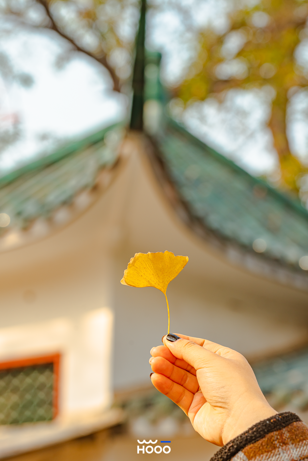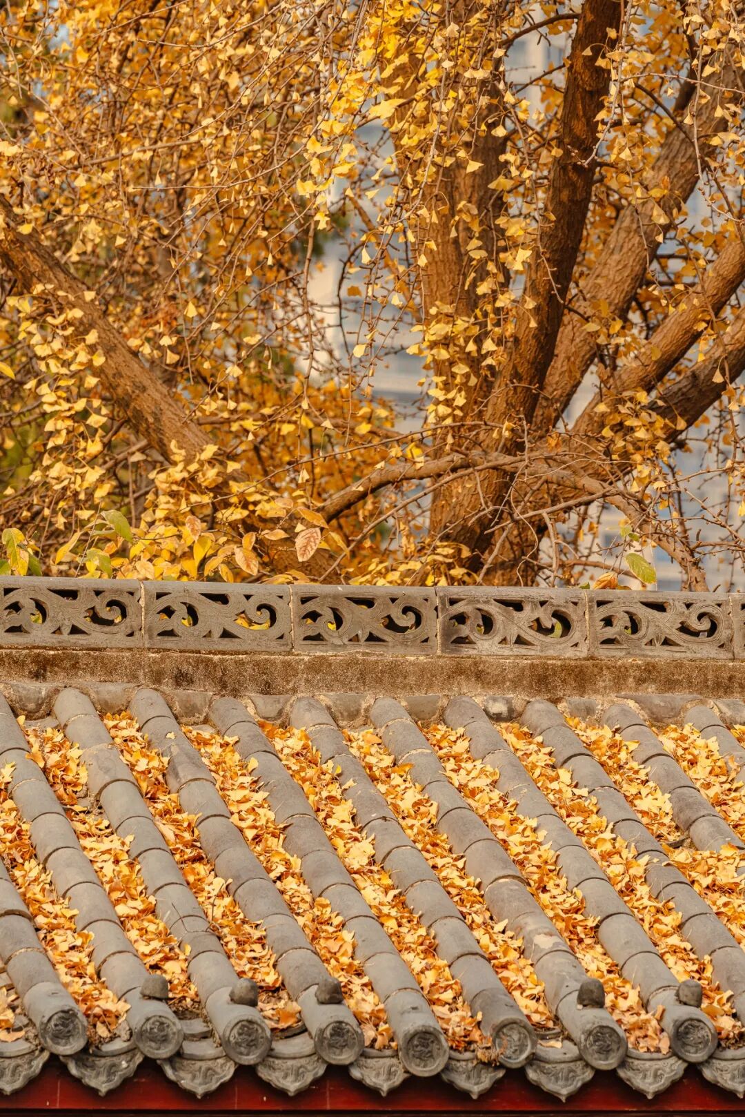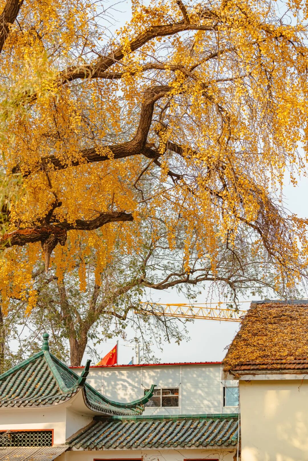 庙宇里银杏独木成林,一阵风起,便是一场金色银杏雨。