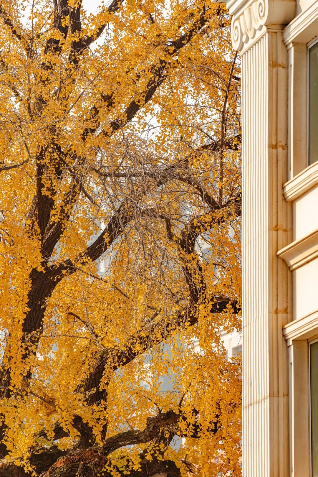 它巍然挺立,葱茏舒展,院前屋后铺满金叶,静静地迎送人们的来去,不卑不亢,自然安静。