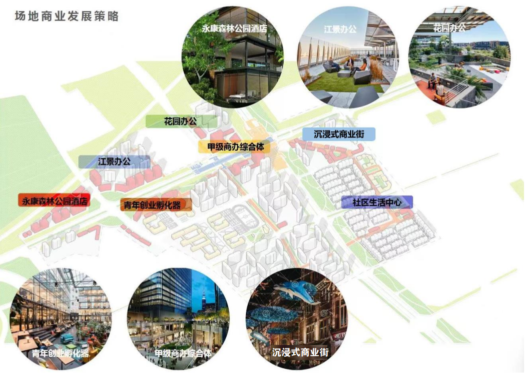 (2)城市商业规划丰富:相关资料显示,白佛桥TOD总建筑面积约为120.76万方,绿地率达到约35%、商住比为24:76。从一张相关规划图中我们可以看到,白佛桥TOD内规划有社区生活中心、沉浸式商业街、甲级商办综合体、青年创业孵化器、花园办公、江景办公、永康森林公园酒店多种业态,学校、公共配套、绿道穿插其中,白佛桥TOD丰富的规划也将弥补目前区域商业和公共配套不足的情况。(信息来源:武侯区白佛桥一体化城市设计规划文件)