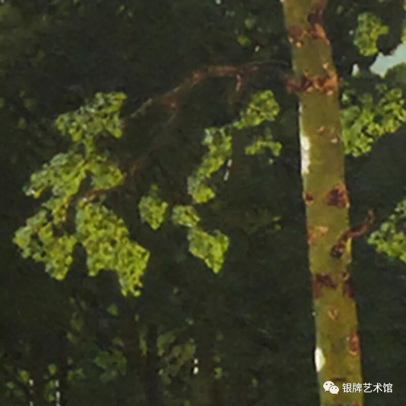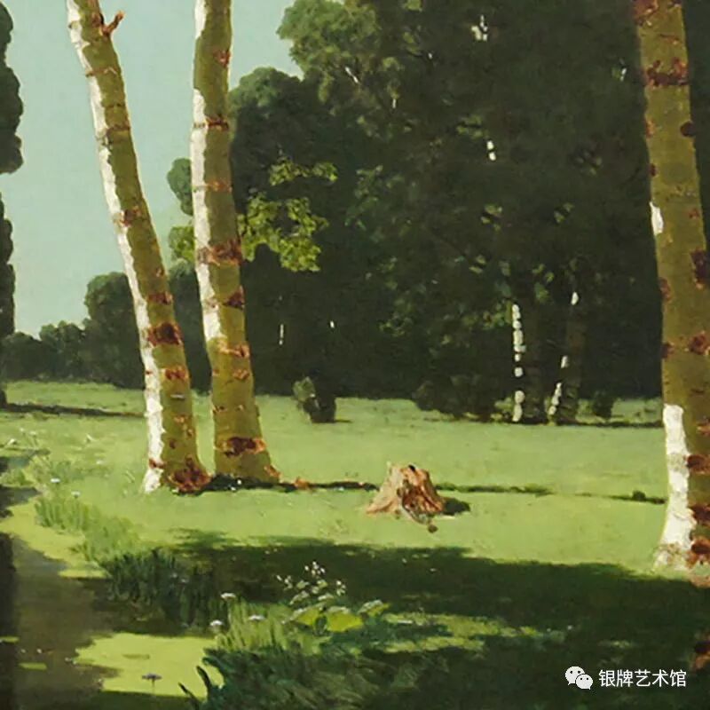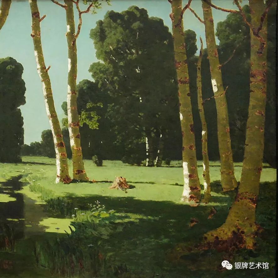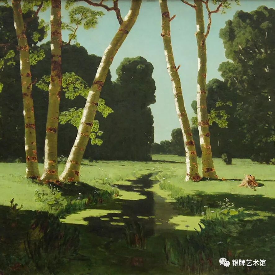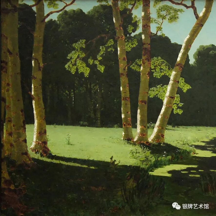 一年后库茵芝又举办了一次只展出单幅作品的展览会,展出的作品就是这幅光影对比极其强烈的《白桦林》,那明亮耀眼的光线,浓烈鲜艳的色彩,比印象派画家还要热烈,套用雷诺阿的话来说,那颜色,“响得像一个钟一样”。