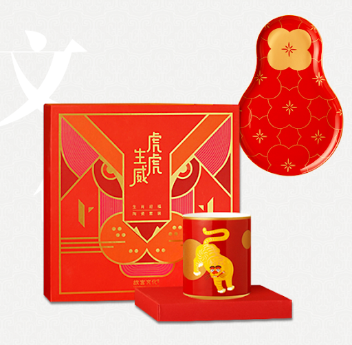 今年,故宫文创以明代红地奔虎五毒妆花纱裱片为创意,推出了马克杯、真丝口罩等小物件。马克杯以虎纹样为主体视觉,内壁配上吉语“虎虎生威”作为装饰,托盘以葫芦为基础造型,取自“福禄”谐音,寓意吉祥。