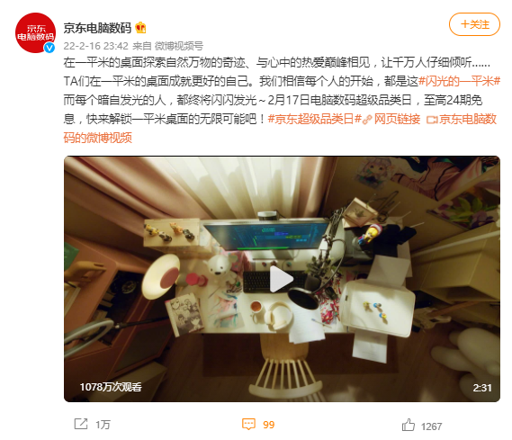 在一平米的桌面探索自然万物的奇迹、与心中的热爱巅峰相见,让千万人仔细倾听……2月16日,京东电脑数码官微发布TVC《闪光的一平米》,借以小见大之法提升用户触达。