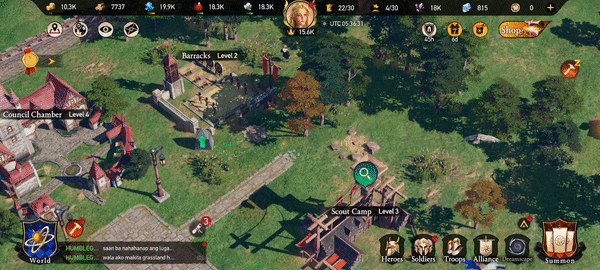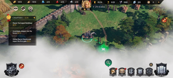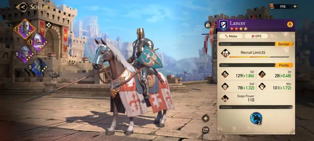 与这套战斗系统对应的是游戏的养成部分:英雄和士兵。和大多数SLG游戏一样,英雄的练度主要由等级、星级、技能、装备、觉醒、属性点构成,技能升级资源主要靠抽卡分解获得,重复英雄可以用来升星,英雄成长到一定等级后可以消耗同品质的角色觉醒(可以获得2个新的特性)。