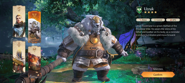 游戏目前提供了四位初始英雄,这些英雄只影响玩家初期的首发战斗角色,和阵营、建筑风格无关。从角色的建模精度和动作细节上看,《剑与家园2》的美术品质基本追上了SLG赛道第一梯队的水平。