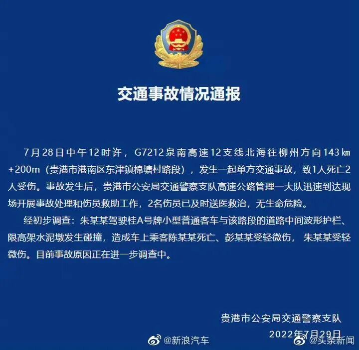 7月28日,广西贵港市港南区柳北高速北海至柳州方向贵港段143公里处,一辆7座小型客车发生交通事故被烧毁。据了解,该起事故为车辆撞到高速公路中间波形护栏与限高架水泥墩后起火,车辆荷载7人,发生事故时实际乘坐3人,其中1名被困人员不幸遇难。