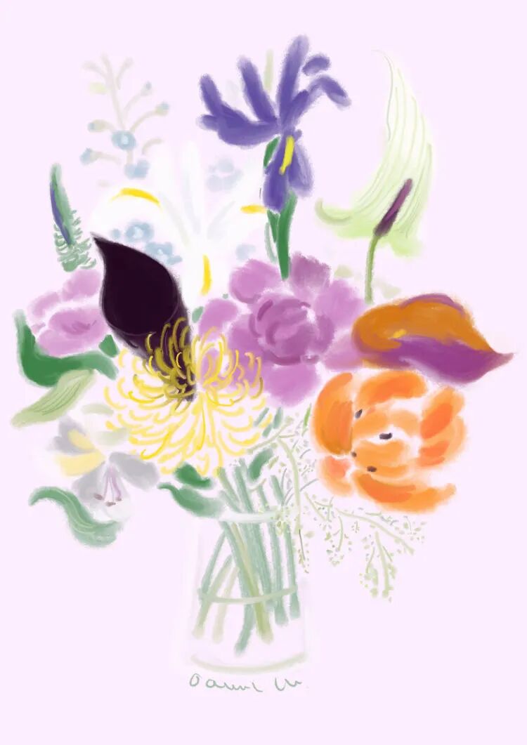 兴之所至,卤猫写生下工作室桌面的花束,也会把花市上遇见的植物绘下来。他的个展里有一系列花卉题材的作品,美术馆的墙上写着:“在不同的季节,你总会爱上不同的花。”