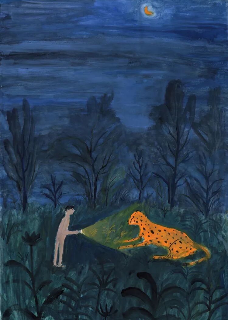 凭着记忆和想象,卤猫回来后画下与豹子月下相遇的场景:弯月嵌于夜空,一个男孩拿着手电筒,照亮一只清醒的豹子。