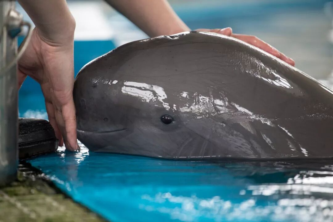 ▲ 湖北武汉,中科院水生所白鱀豚馆,工作人员正在给江豚喂食。图/图虫·创意