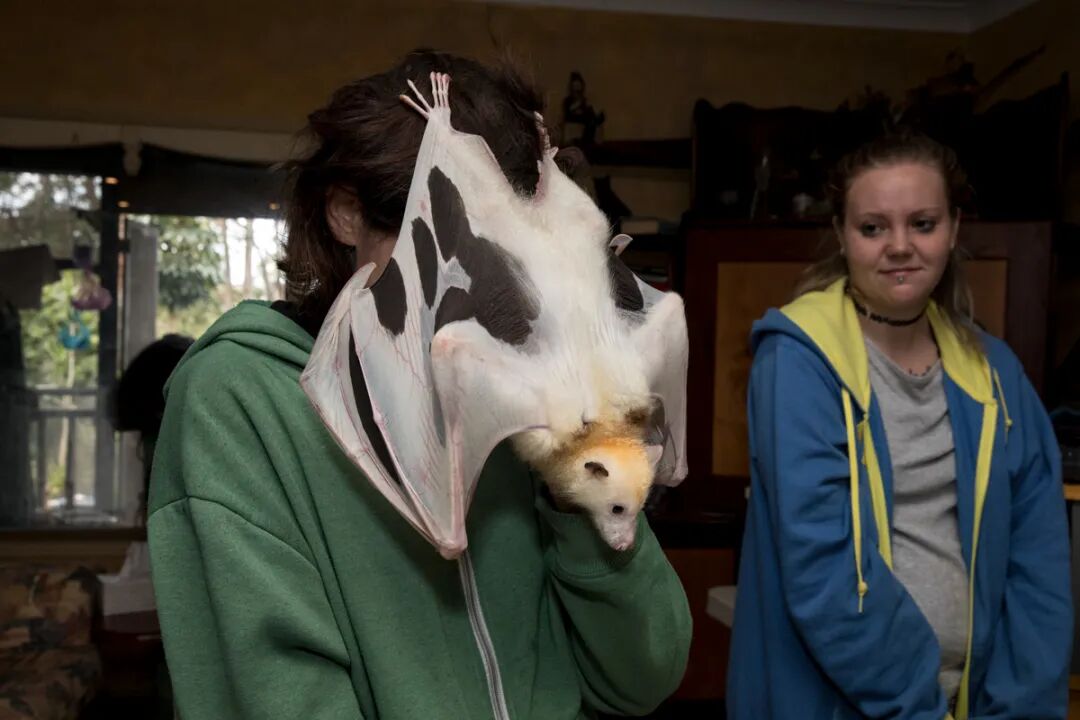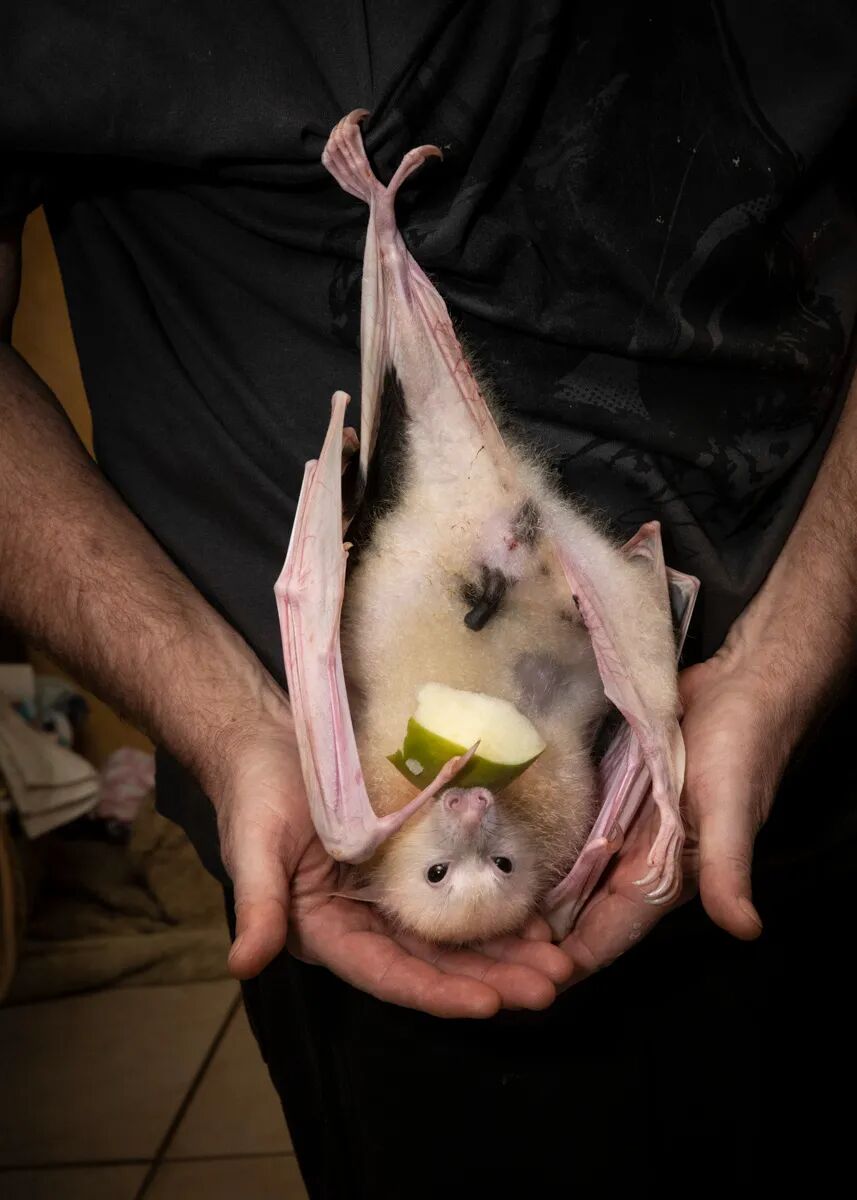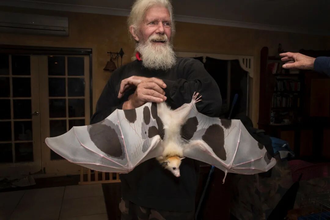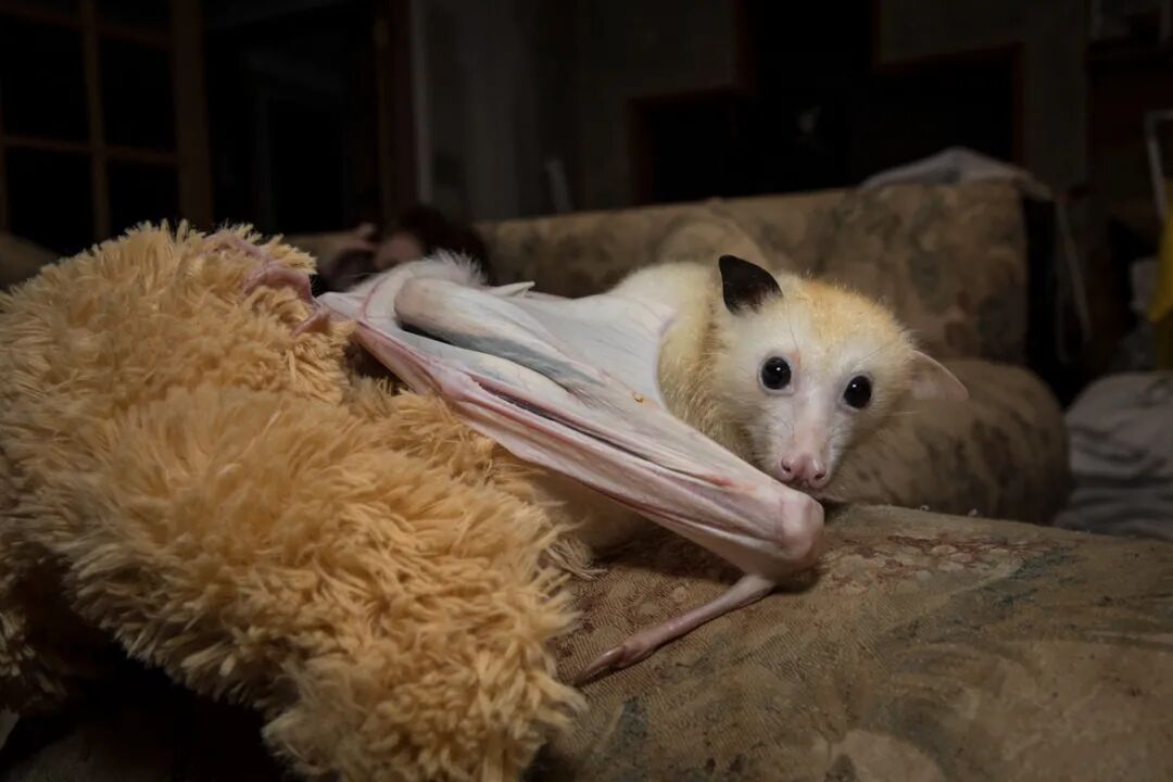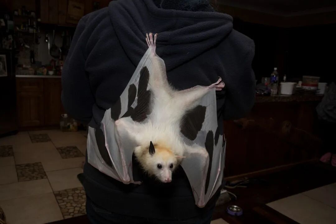 Tal'ngai是一只被确认为白化灰头飞狐,患有严重的晒伤,在澳大利亚的黄金海岸被澳大利亚蝙蝠诊所的工作人员救起。他们最初以为地上有一张纸,正要清理一下的时候,才发现它动了一下。他被确认为白化灰头飞狐,有一个罕见的基因突变。Tal'ngai半透明的翅膀和粉红色的皮肤使他很容易受到捕食者的攻击,特别容易受到阳光的伤害。他在康复后也不能和他的兄弟姐妹们一起被释放。Tal'ngai得到了澳大利亚蝙蝠诊所和野生动物创伤中心主任Trish Wimberley的悉心照料,她给他取名为Tal'ngai Dha'run,在Yugambeh的土著方言中意为“白翼”。