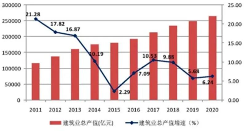 图1 2011-2020年全国建筑业总产值及增速