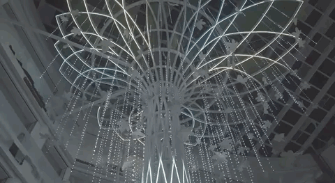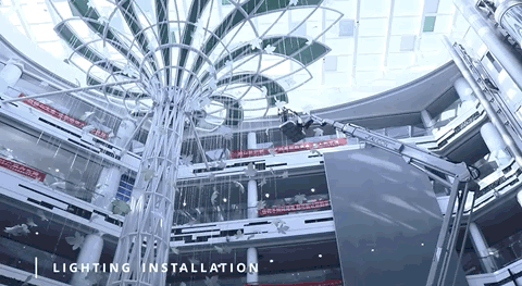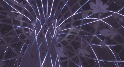 最近我们刚在天津的商场里面给30米高的竖形雕塑做了改造,我用了一些创意编程的手法加入灯光效果。传统的设计它是固定化的,而代码我们既可以控制它,又会产生一些意想不到的效果,我们想打破传统的形式,多加一些随机的美感。并且地区是在滨海新区,当地也是生态城,于是我们结合当地的天气,抓取了天气网站的一些数据,实时做了视觉反馈。消费者在体验完我们的作品之后,就会联想到背后的产品。