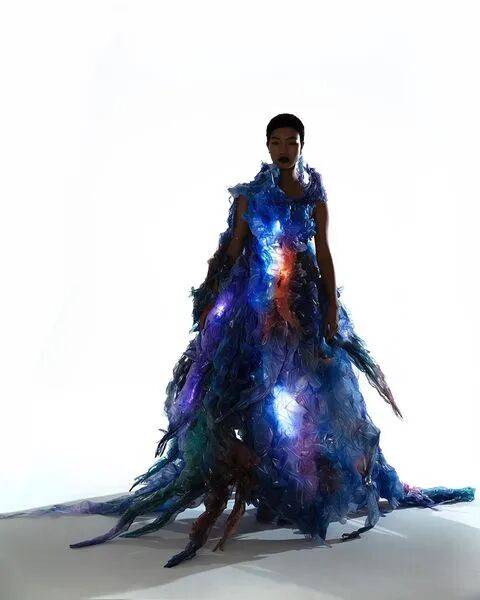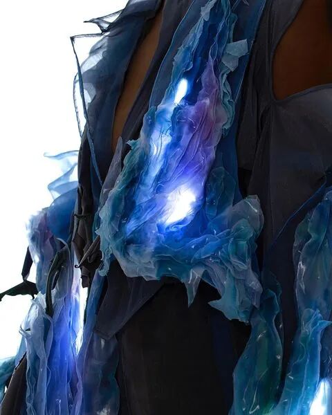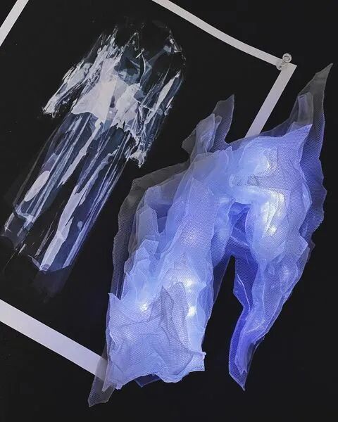 Weiran选择在作品中制作了多层次的面料,结合LED灯光装置,通过负空间的形式去展示概念,为我们带来了独特的视觉效果。