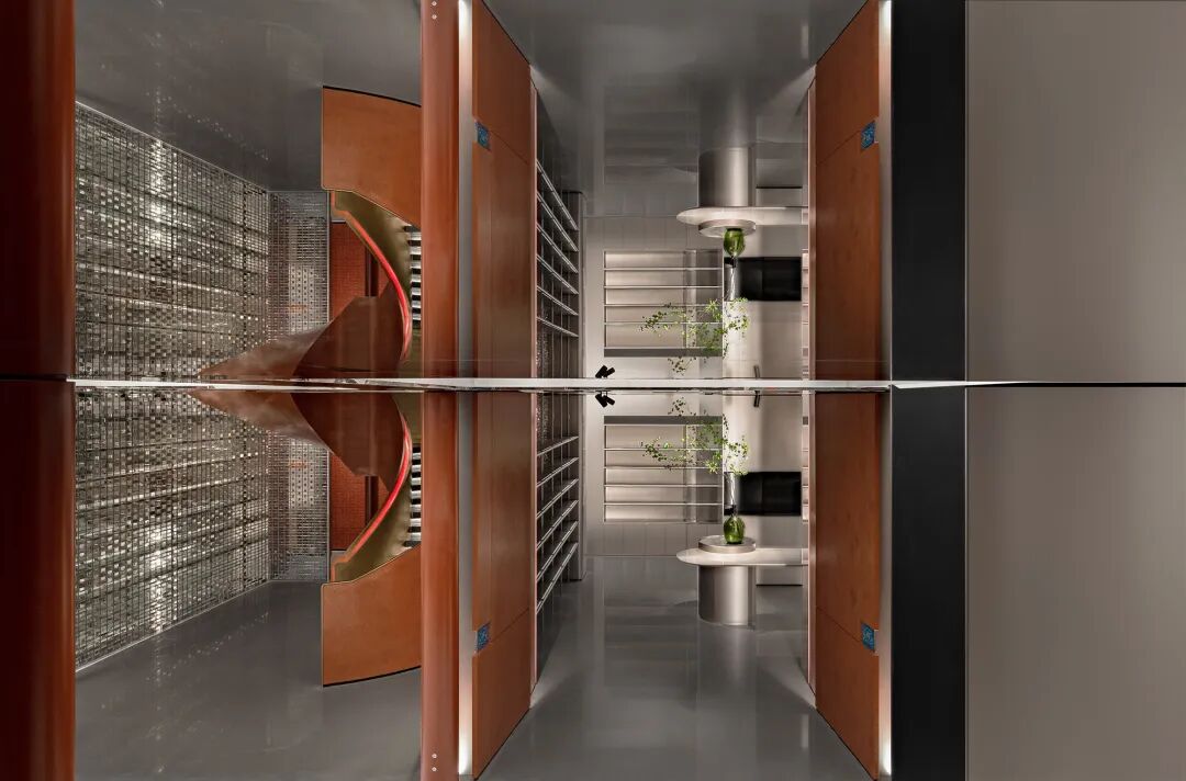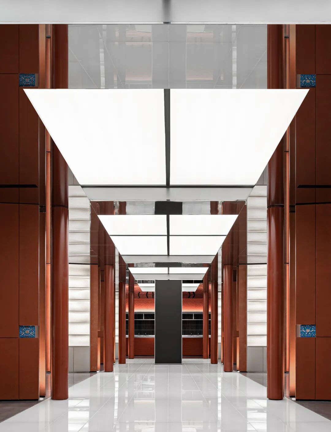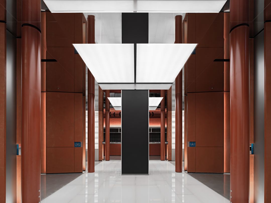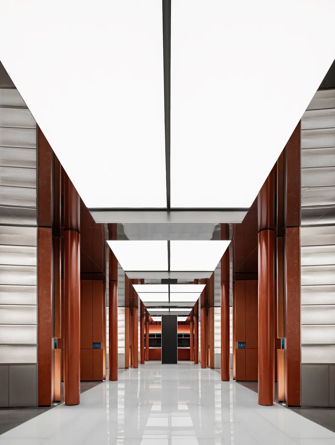 空间设计的逻辑遵循东方的礼仪秩序。在春熙北路的起点处,一条长廊被安排在一个对称的布局中,有条不紊的中轴线,向未来的东方迈进。12个红漆柱廊和仿照中国古代帝王专用道路的玉石绿道构成了一个类似于舞台剧的场景。