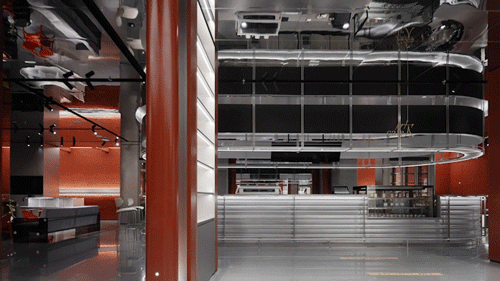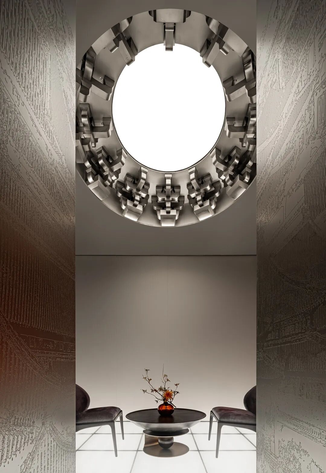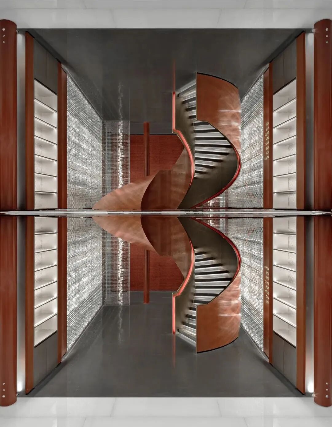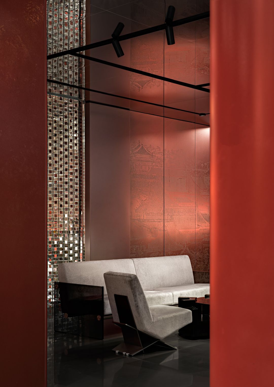 空间设计的逻辑遵循东方的礼仪秩序。在春熙北路的起点处,一条长廊被安排在一个对称的布局中,有条不紊的中轴线,向未来的东方迈进。12个红漆柱廊和仿照中国古代帝王专用道路的玉石绿道构成了一个类似于舞台剧的场景。