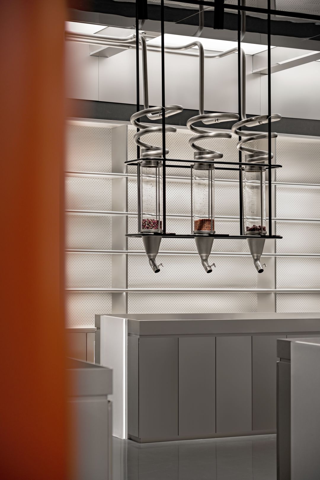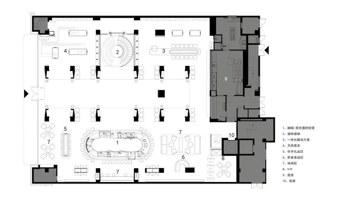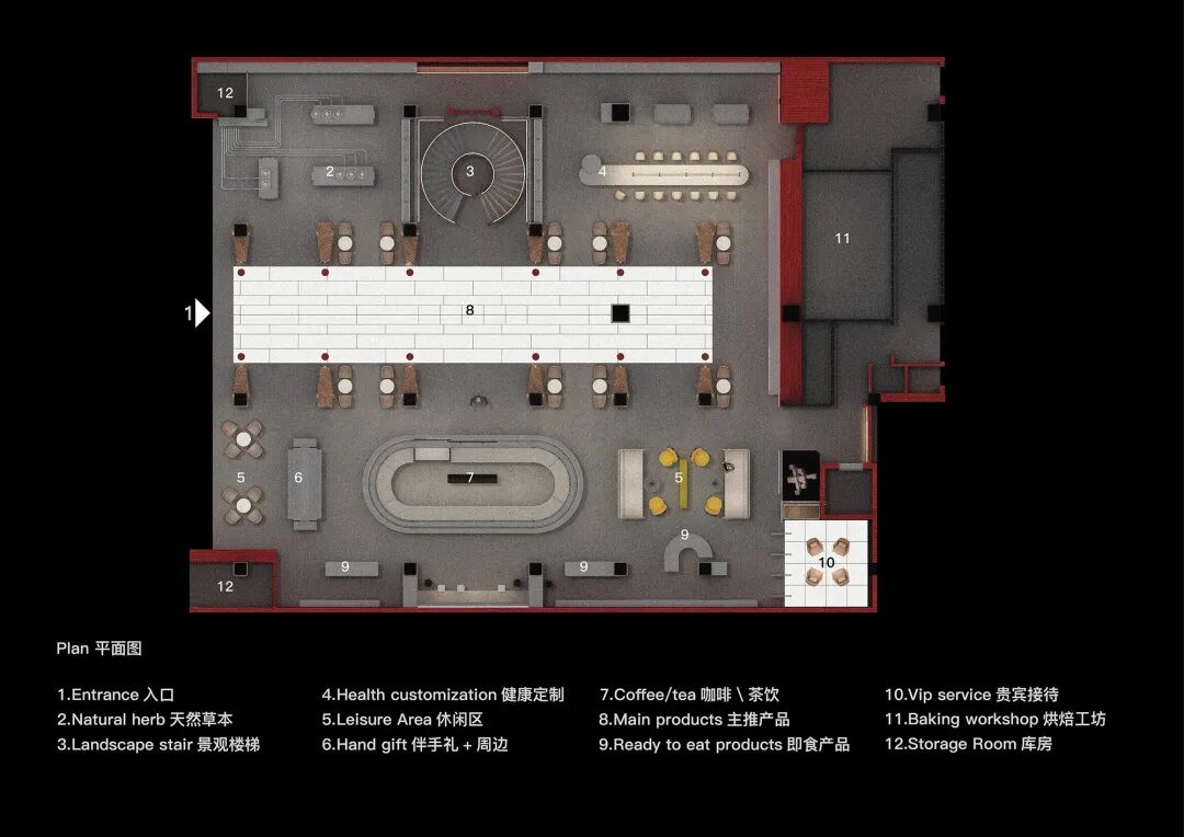 空间分为三个功能区,提供草药咖啡和饮料、健康简餐和保健品。三个区域的展示因其属性和提供的产品而不同。