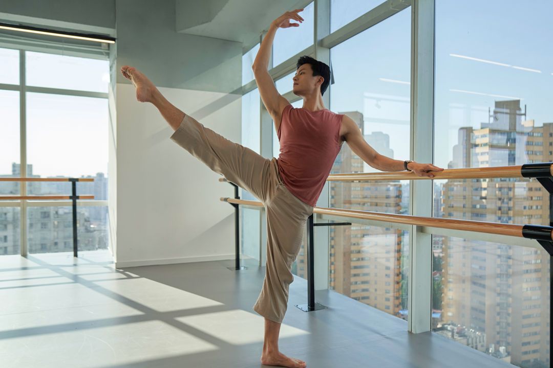 因为他个子比较高,为保持芭蕾舞旋转时平衡,他必须训练出强有力的腰腹肌肉;而作为一名男性芭蕾舞演员,还需举得动舞伴,他就去做俯卧撑等力量训练,将大臂和肩背练出肌肉来。