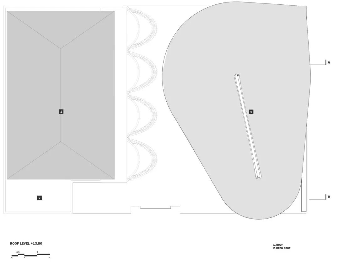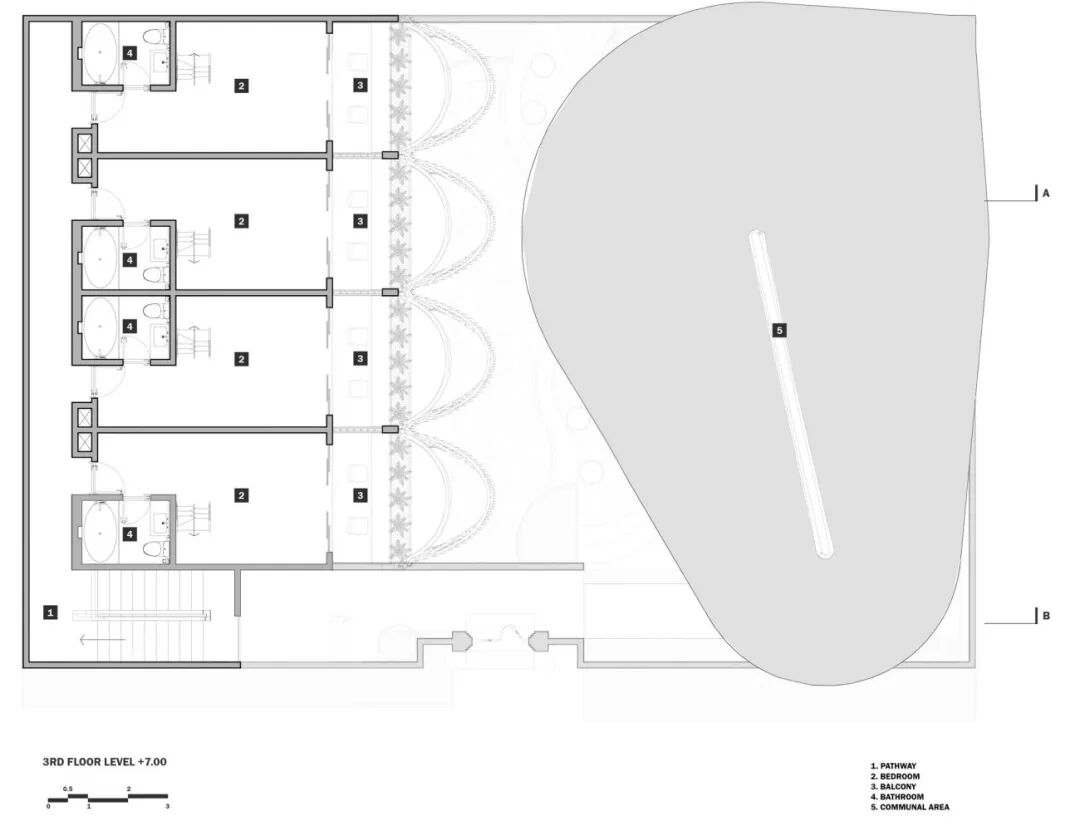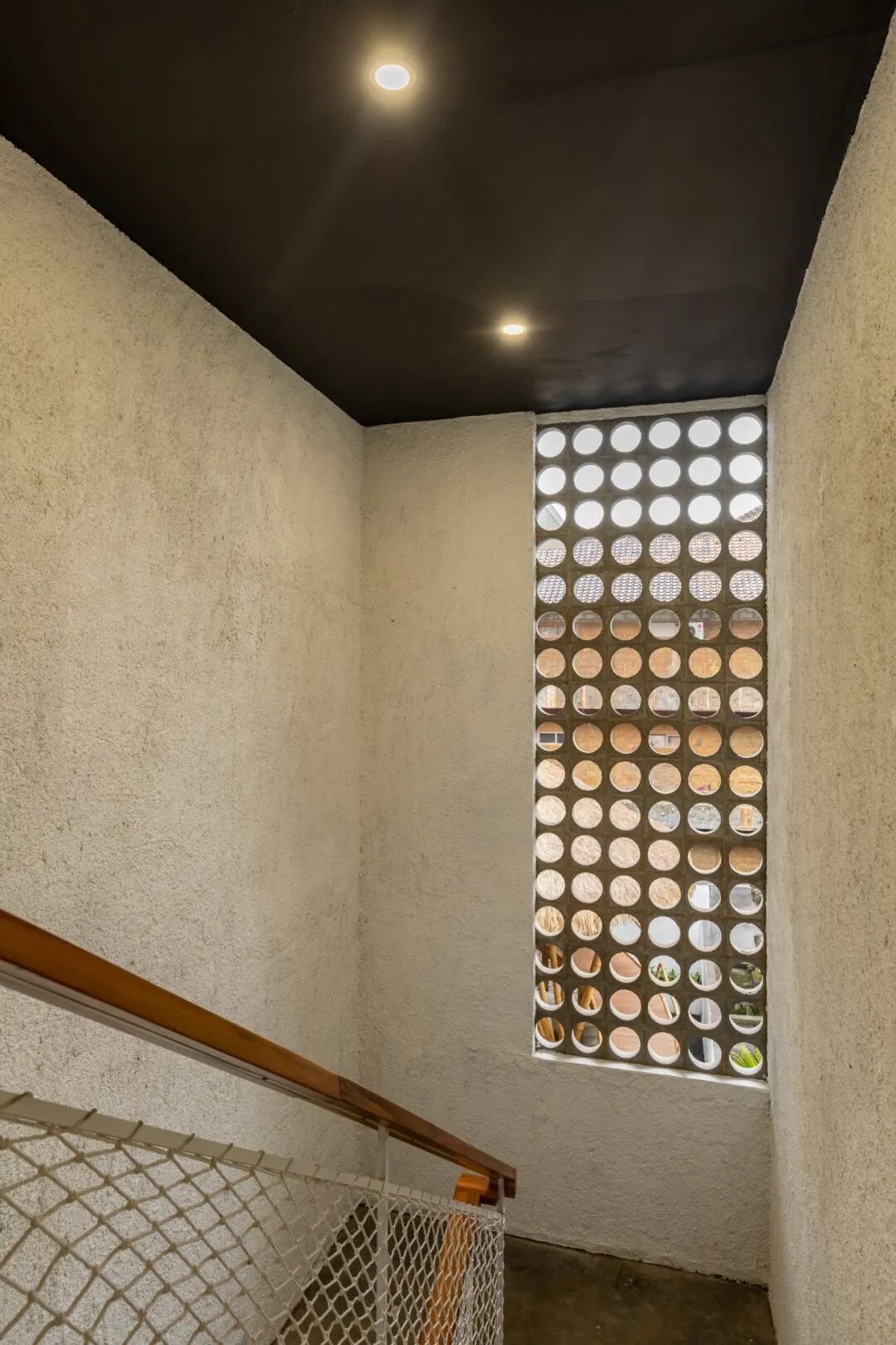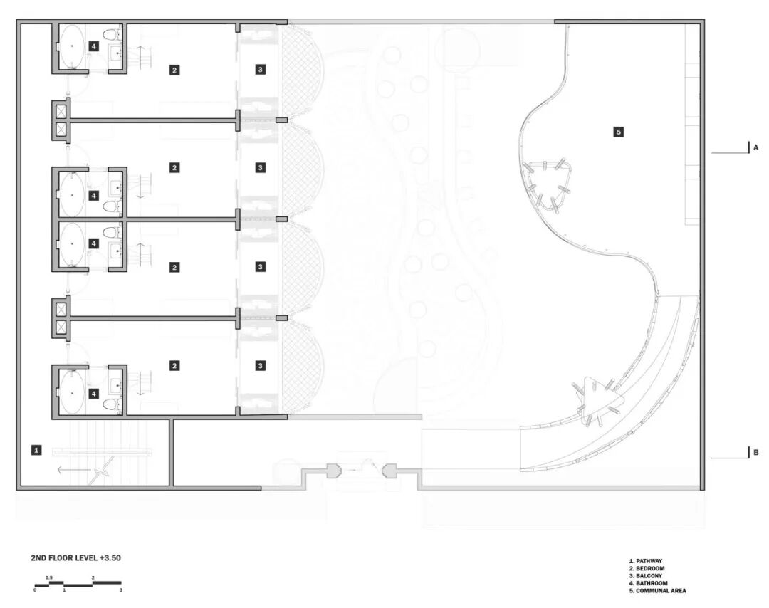 公共区域设置了一个巨大的竹子屋顶,横跨两层,两层之间有一个木制坡道连接。在上层,他们可以一边工作一边欣赏池景和美丽的曲线图案,让眼睛平静下来,唤起一种舒缓的氛围。下层则是互动和聚集空间,可以将脚浸入水中玩耍。除了公共空间,这里还设有设备齐全的厨房和食品贮藏室,供大家聚会和共享。