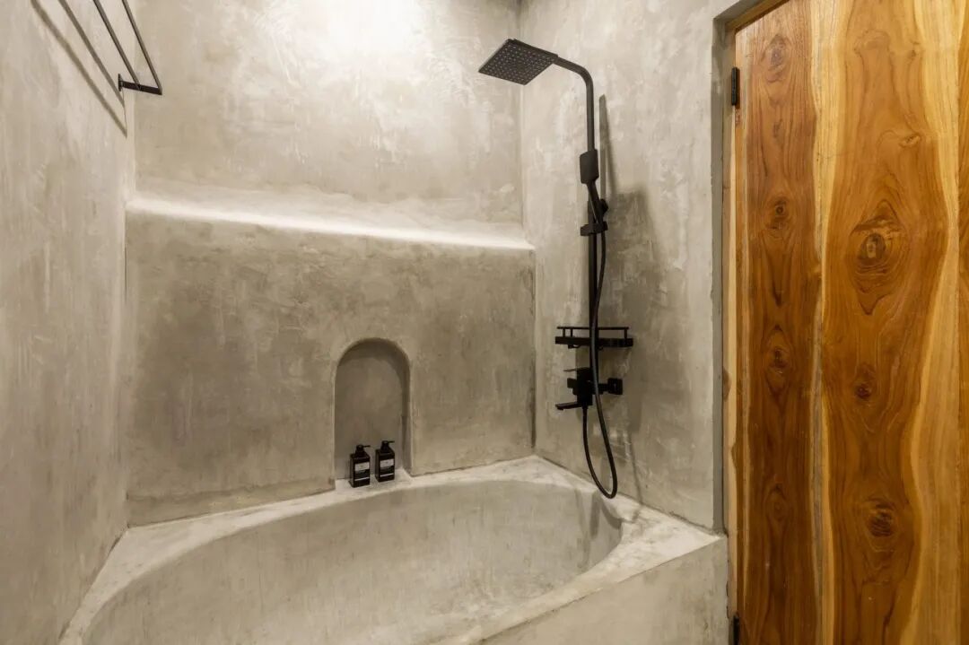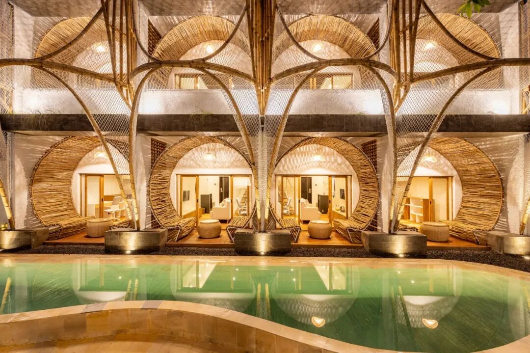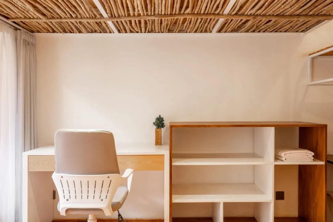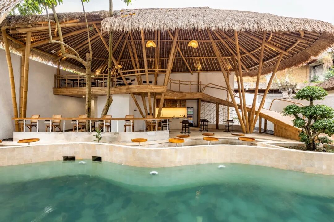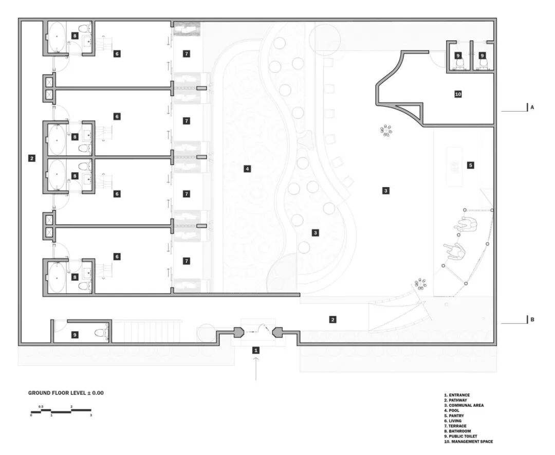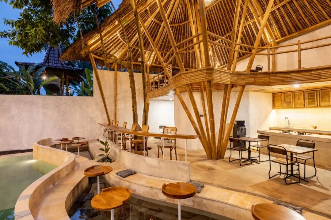 The communal area is set with a massive bamboo roof, spanning two levels with a wooden ramp connecting the two floors. On the upper level, they can work and enjoy the work while enjoying the pool view and curves pattern calming the eyes, evoking a soothing atmosphere. The ground level boosts interactions and gathering while soaking their feets under water. In addition to the communal space, it features a fully equipped kitchen and pantry as they gather and share.