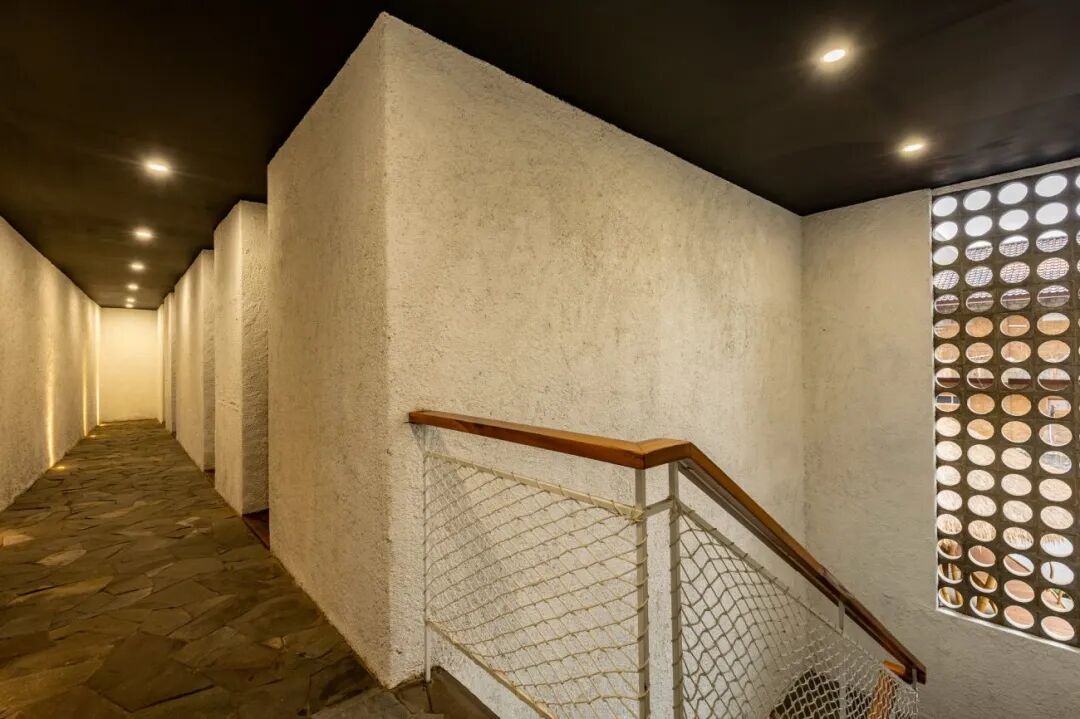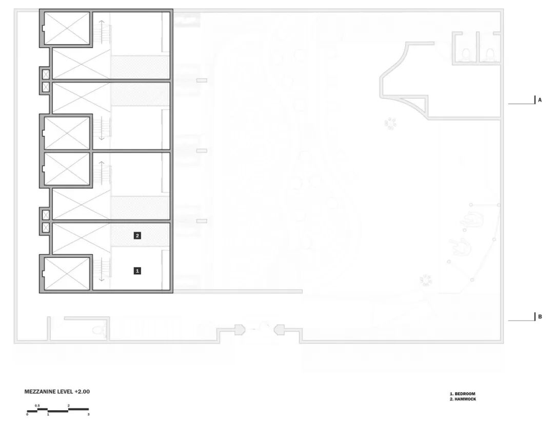 私人区域建有3层,每层都有不同的体验。一楼包括一个大露台,上面摆放着咖啡枝制成的躺椅,可以从房间直接进入游泳池。第二层的阳台躺椅同样是用咖啡树枝建造的,不同的是,它还拥有一个向外延伸的吊床,以不同的方式来体验阳台带来的乐趣。三楼阳台上有一张长长的工作凳,可以看到周围令人兴奋的景色。房间内的设计采用带有独特楼梯的夹层系统连接客厅和卧室,这样做可以最大限度地提高住户的舒适感,将工作和度假巧妙结合起来。