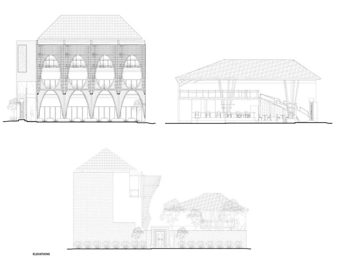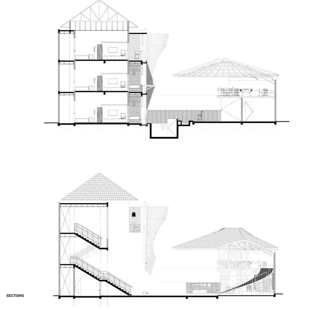 设计根据现有结构建筑,将弯曲的竹子作为立面和结构,与其他天然材料(如天然石头、咖啡枝、木材)相结合以增强该建筑的亮点,同时将可持续性发展的理念贯彻其中。这种拱形竹子结构能够传达数字化时代工作的灵活性,在建筑立面使用中空的造型进行布置,可以增加建筑与环境的相互呼应关系,同时也可以提高阳光照射,增添能见度。