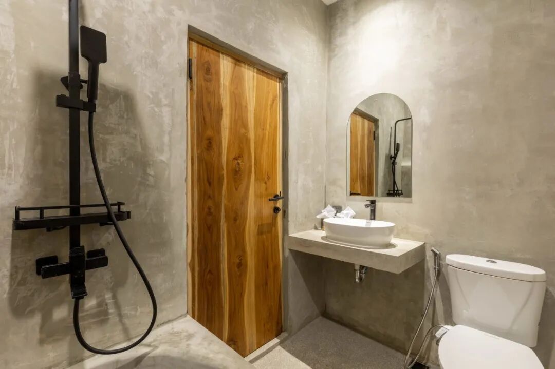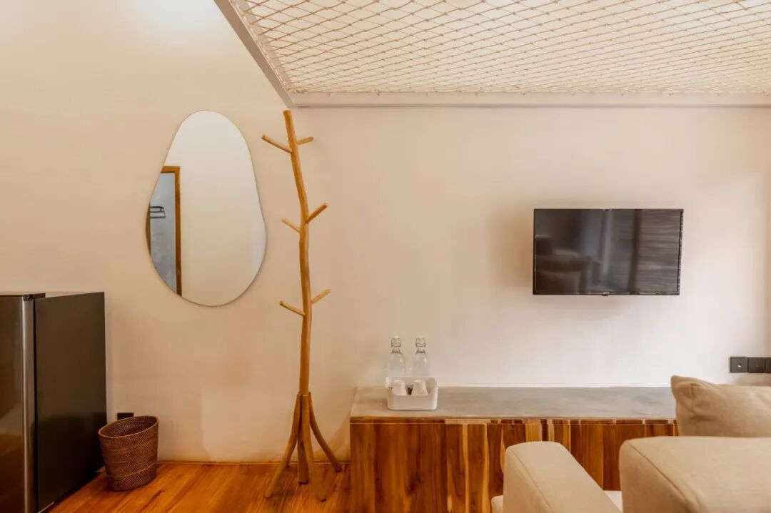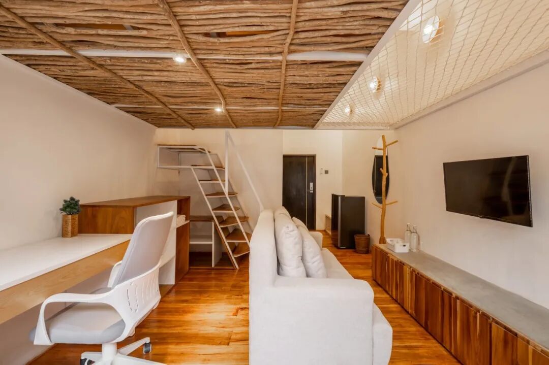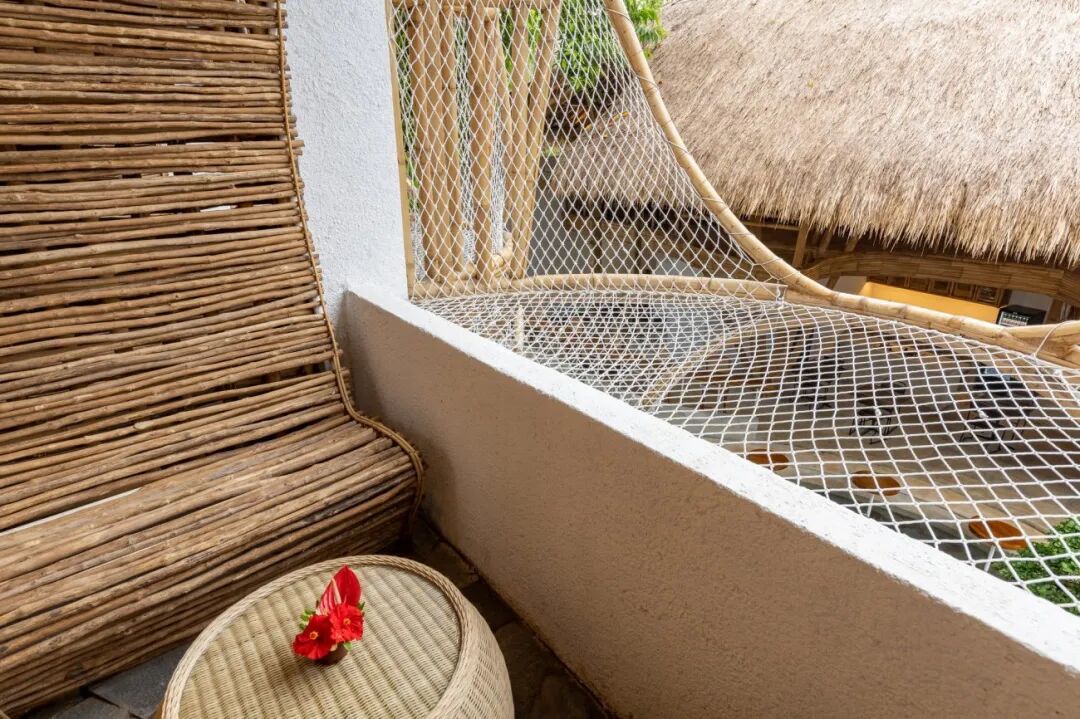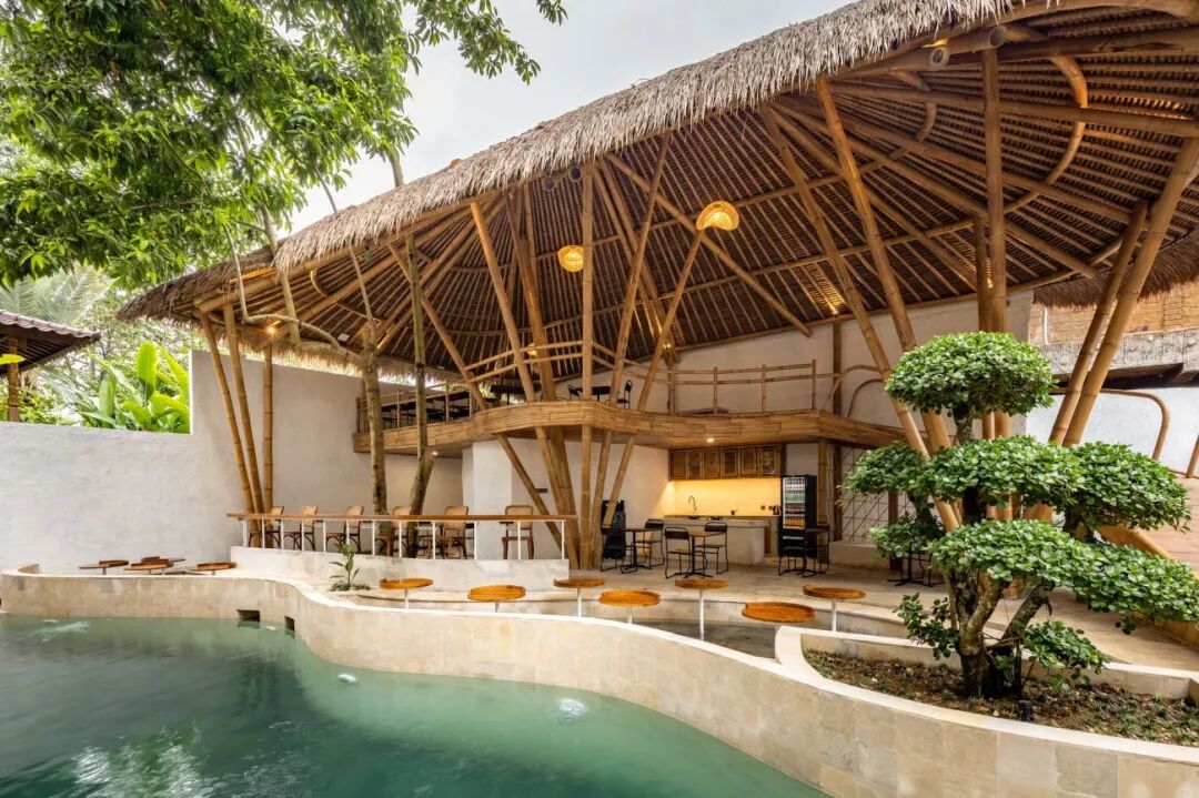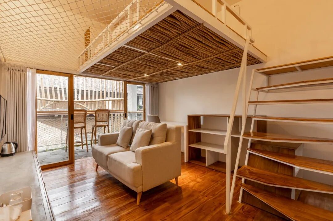 The private areas were built with 3 floor levels, ensuring each level has a different experience. The ground level includes a big terrace with arranged coffee branches as the lounge chair, with direct access to the pool. Second level was built with the same coffee branches, in addition giving the hanging nets as a hammock as the focal point to give a different way to experiencing the balcony. And the third floor features a long work stool table with exciting views towards its surroundings. The interior design uses a mezzanine system with a unique staircase to connect the living room and bedroom. They are all designed to maximize the user’s sense of comfort, combining work and vacation.