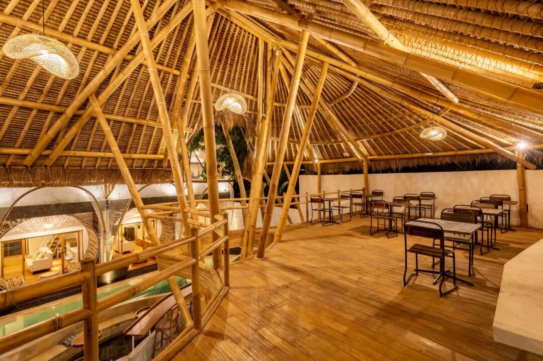 Designed from the existing structural building, Ruang Nyaman created the curved bamboo facades as the protagonist material, combining with other natural materials such as natural stones, coffee branches, wood to react and enhance the cultural context of this site, and developed with sustainable considerations. For the facade, arch shaped bamboo conveys the sense of flexibility towards the digital nomads era of working. Using a secondary skin facade that is arranged in a hollow and with enlarged shape on top of it, as a natural response to the surrounding environment, from visibility to sun exposure.