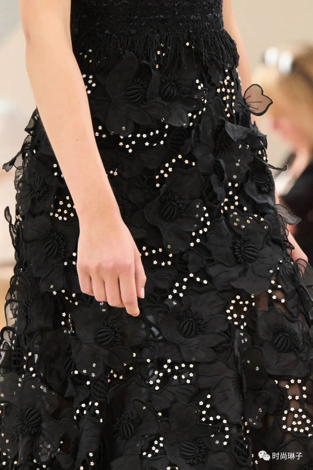 点缀着一簇簇刺绣叶子或黑白流苏的白色薄纱连衣裙,以及经典的小黑裙,轻盈流动。