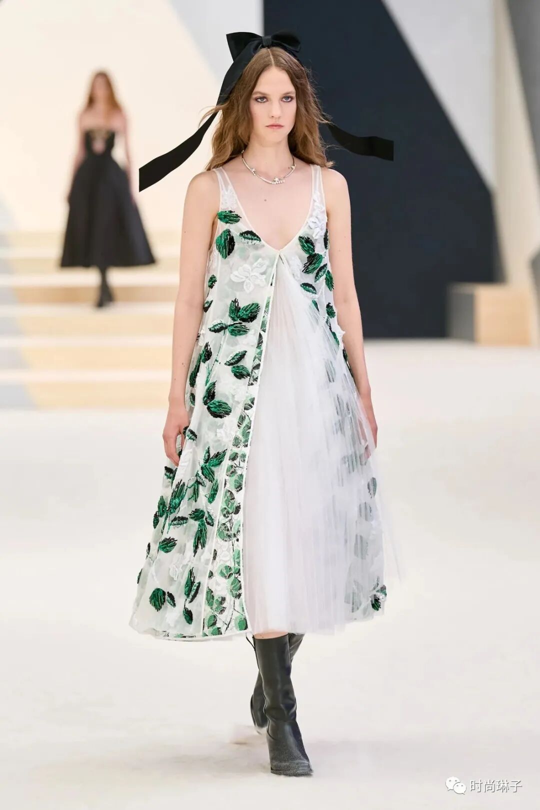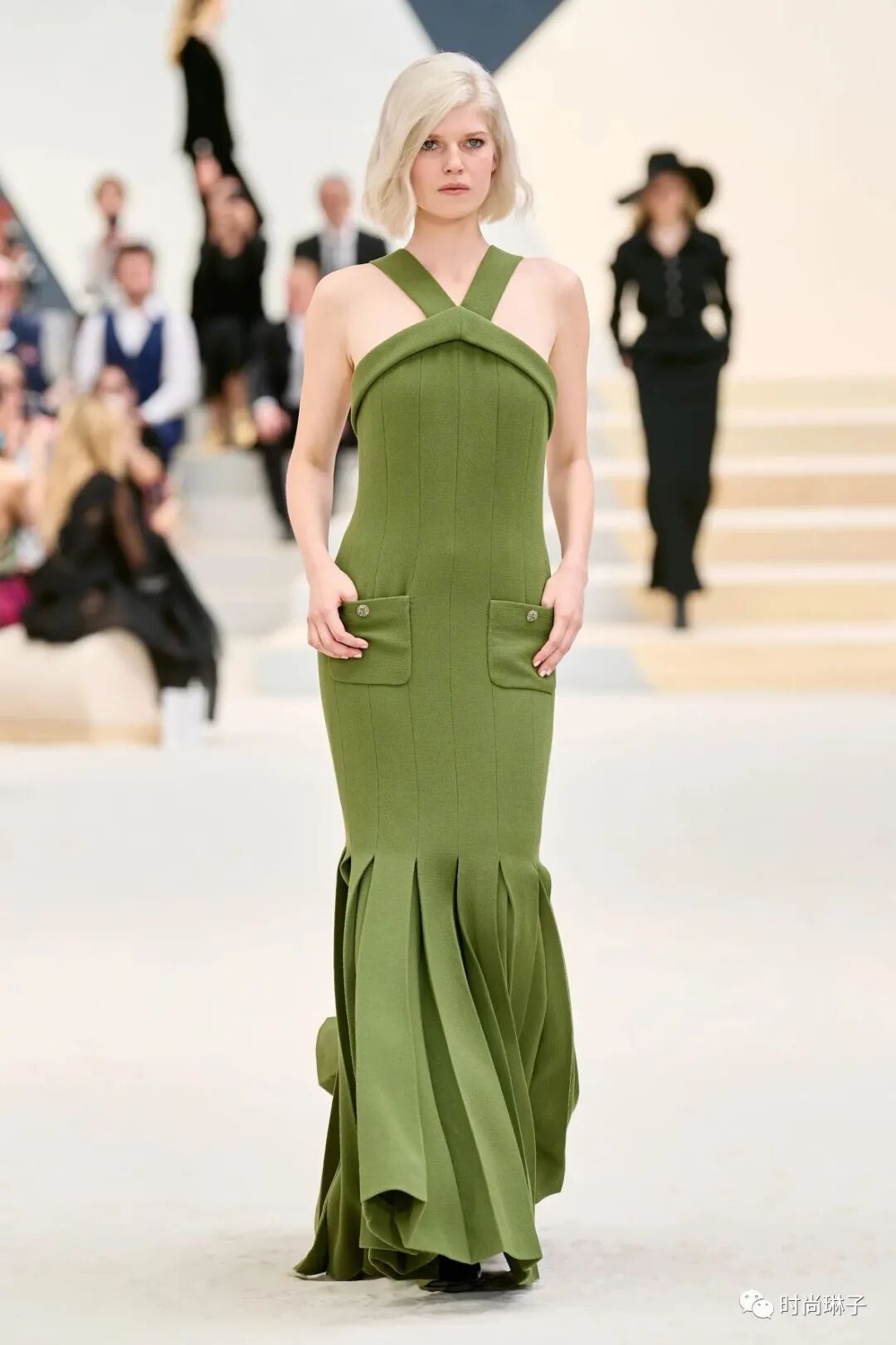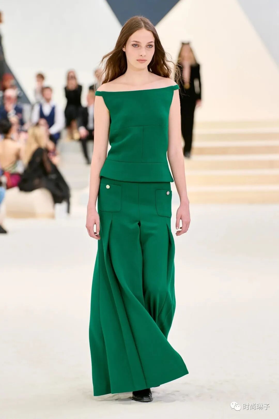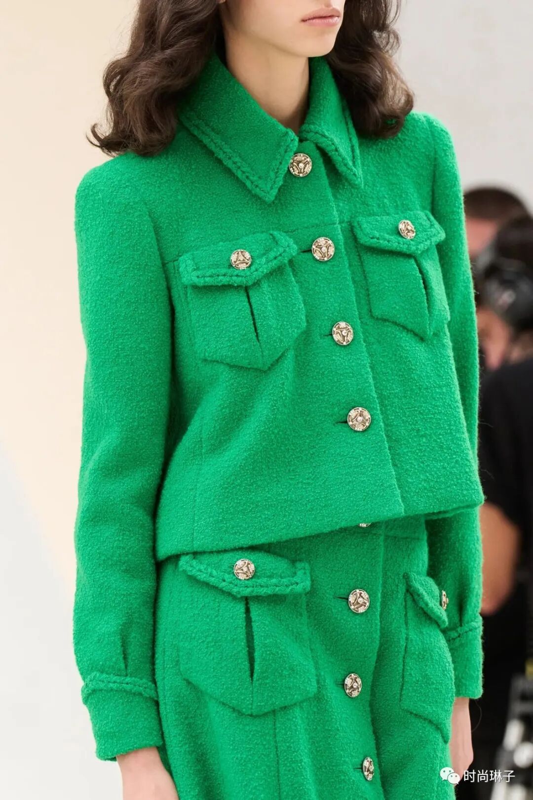 伴随着Sébastien Tellier 创作的交响乐配乐,模特身穿绿色套装步入秀场,该造型延续了香奈儿1930年代经典款风格的同时,也打破了香奈儿通常的颜色代码。