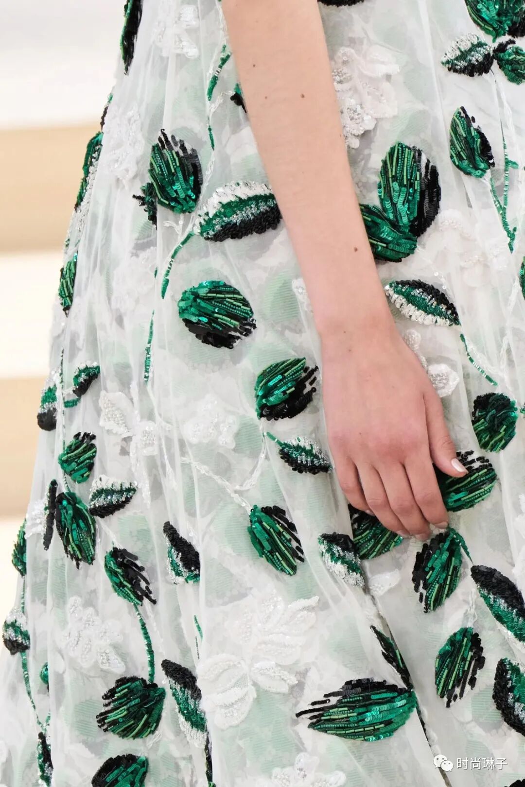 绿色紧身长裙简洁利落,一系列花卉图案定义了香奈儿连衣裙的精致魅力。