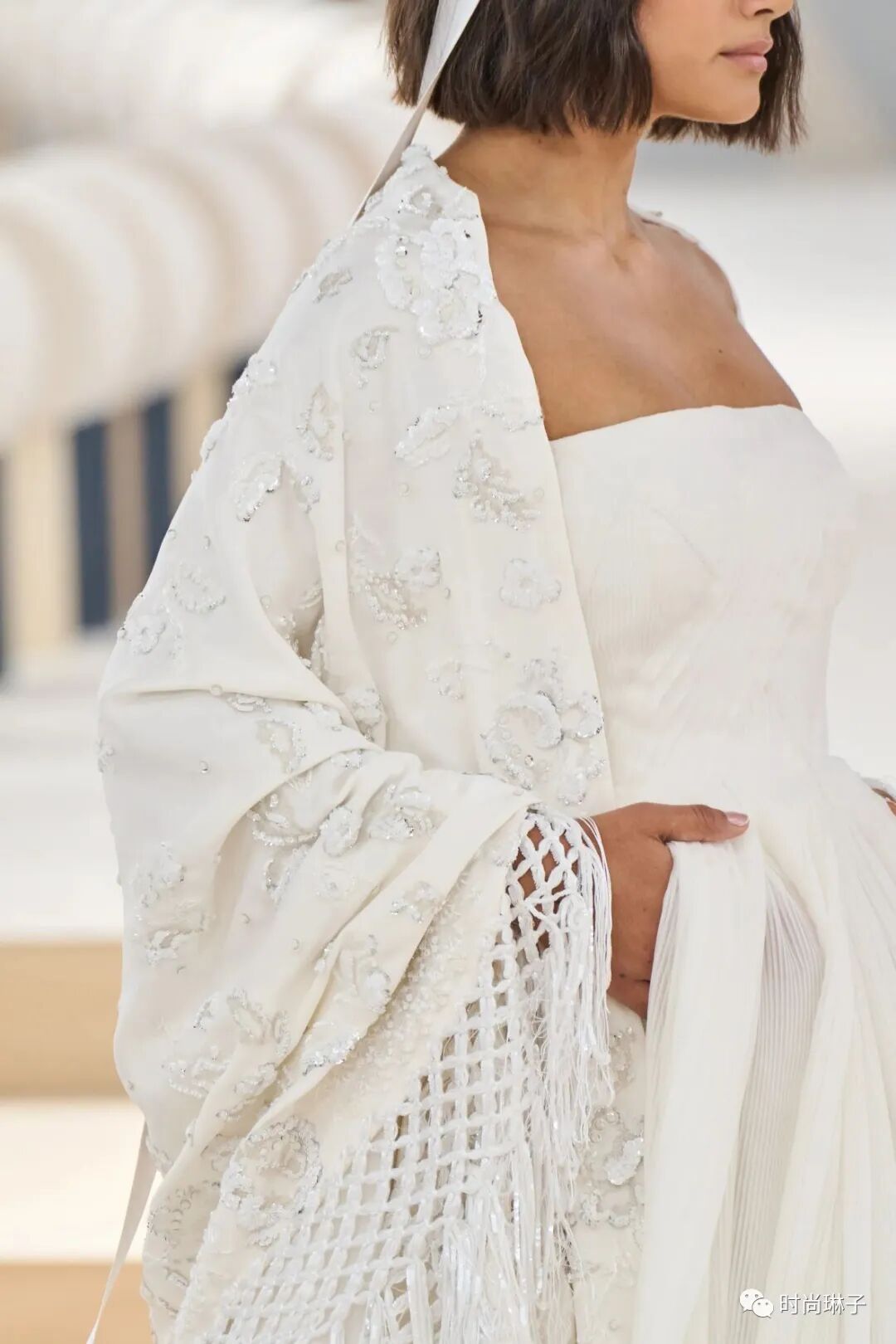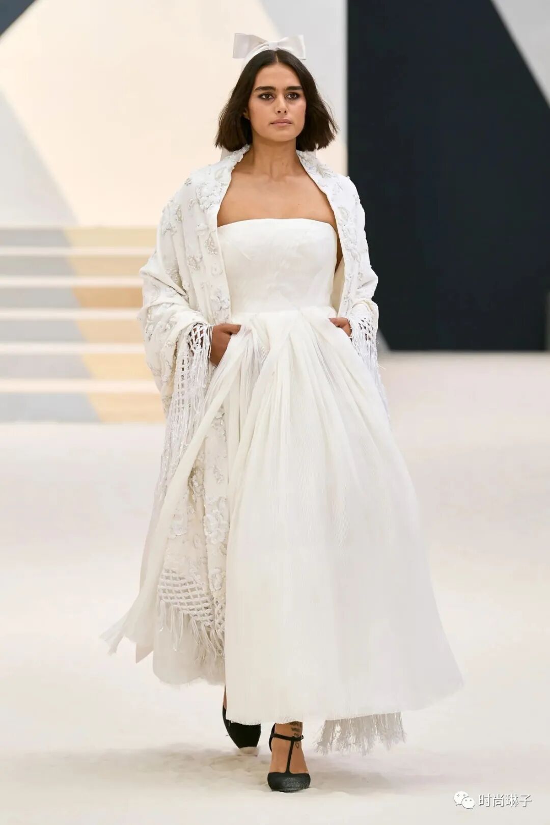 打破常规的白色婚纱造型依然压轴出现在香奈儿2022秋冬高级定制系列中,搭配白色蝴蝶结头饰和波西米亚风的刺绣披肩,赋予了女性打破陈规的力量。