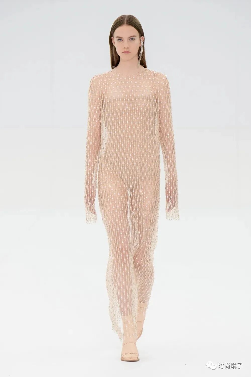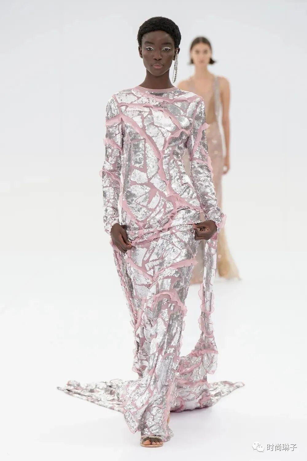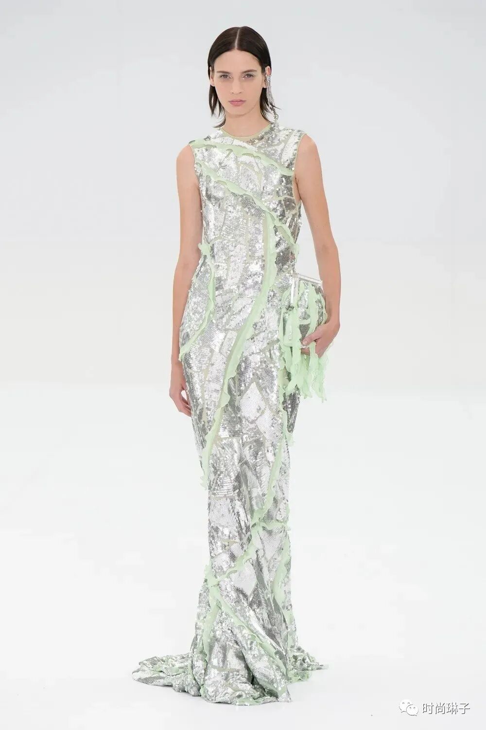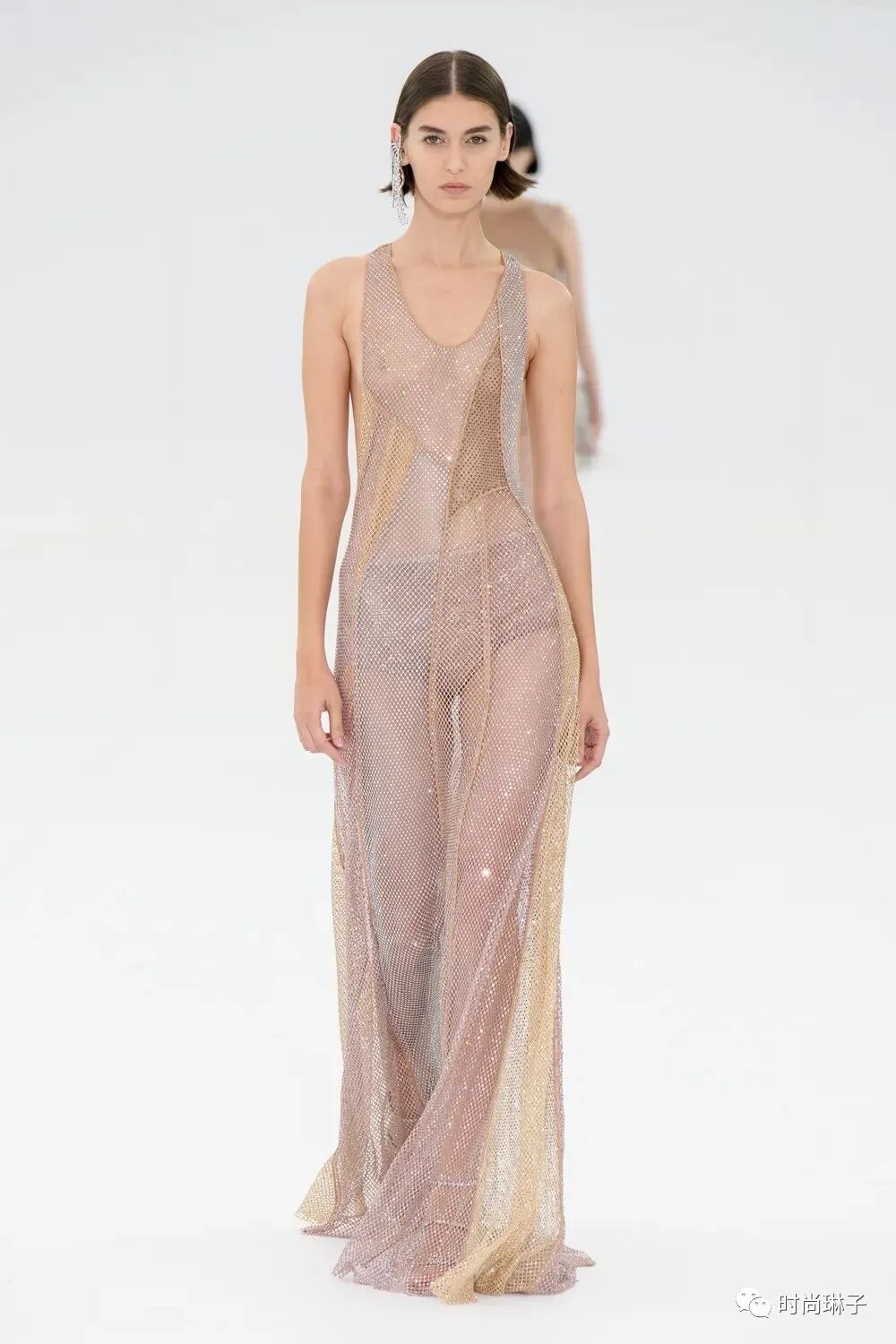 拼接的透明网裙以及镶嵌着碎片化亮片的薄纱裙 好似撕裂的事物又重新被连接在一起。