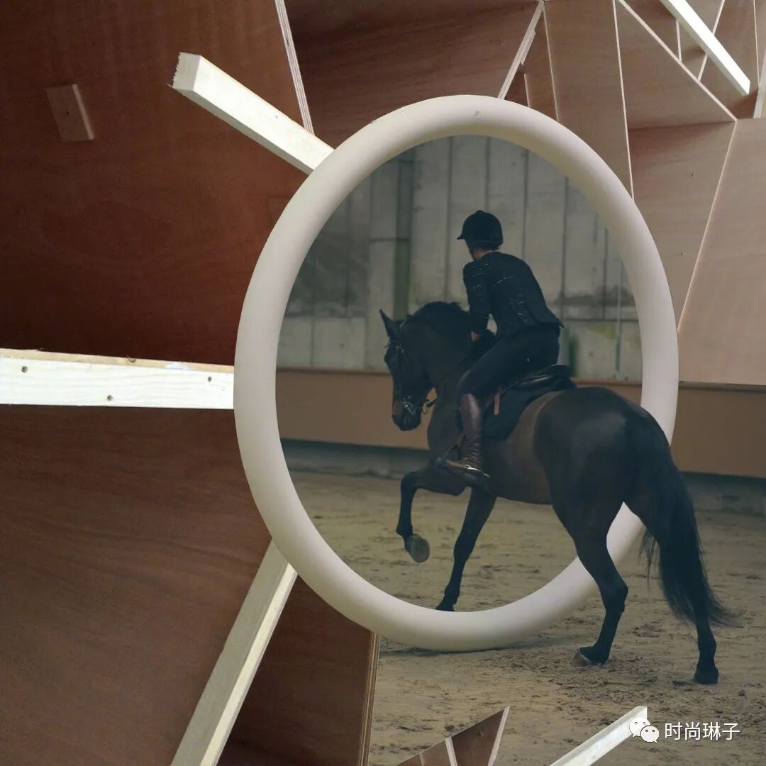 由艺术家Xavier Veilhan拍摄的短片中香奈儿品牌形象大使Charlotte Casiraghi身穿2022春夏高级定制系列中的黑色斜纹软呢外套,化身技艺精湛的女骑手,与骏马默契配合,以其魅力之姿展现了法国艺术家Xavier Veilhan设计的雕塑和绘画作品中的迷人神韵。