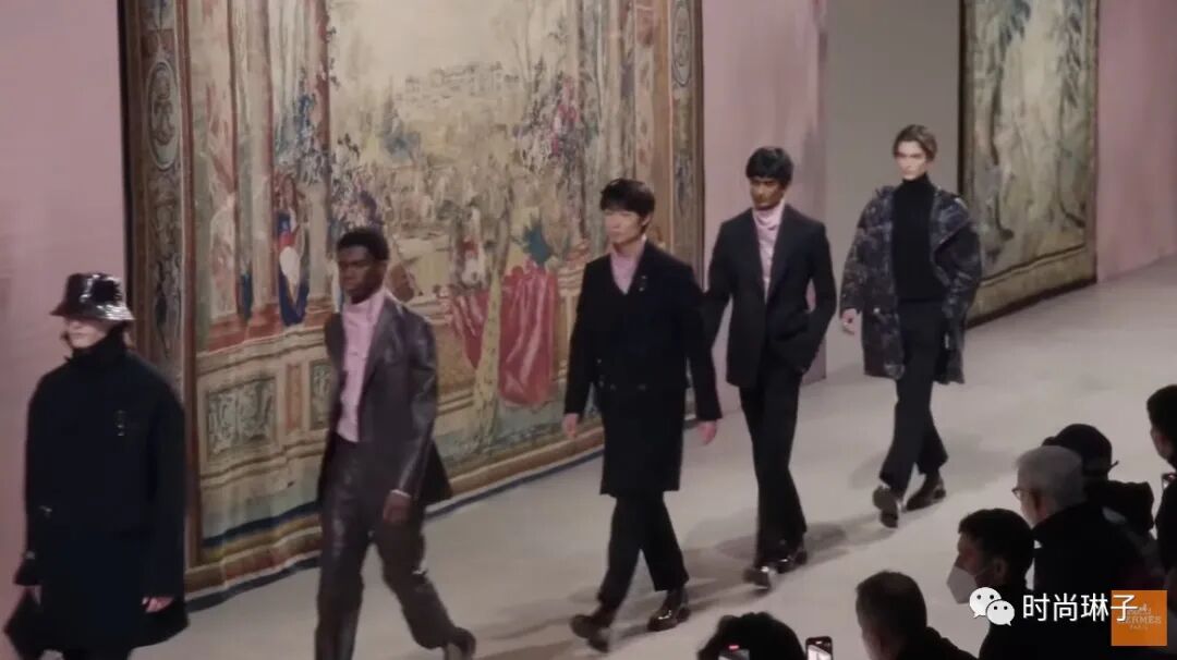 该季男装秀再次与艺术派导演 Cyril Teste 合作,在位于巴黎的Le Mobilier National国家家具馆内的一处空间举行,墙上的艺术挂毯为时装秀增添了几许诗意和优雅。