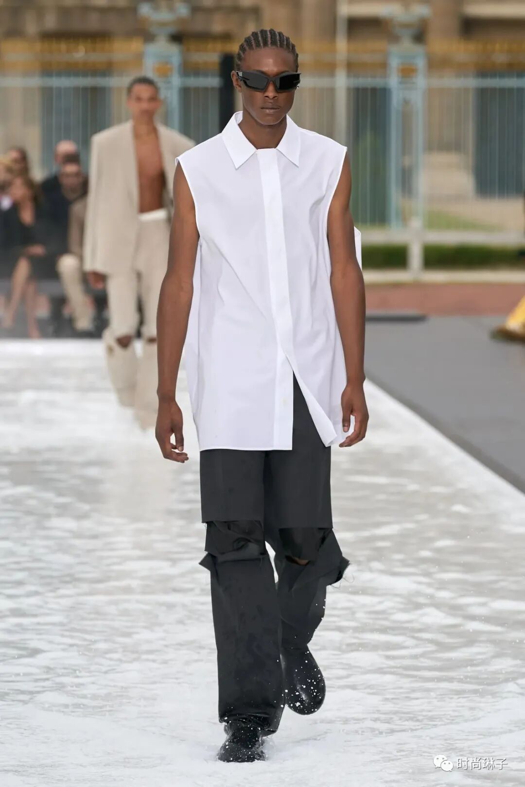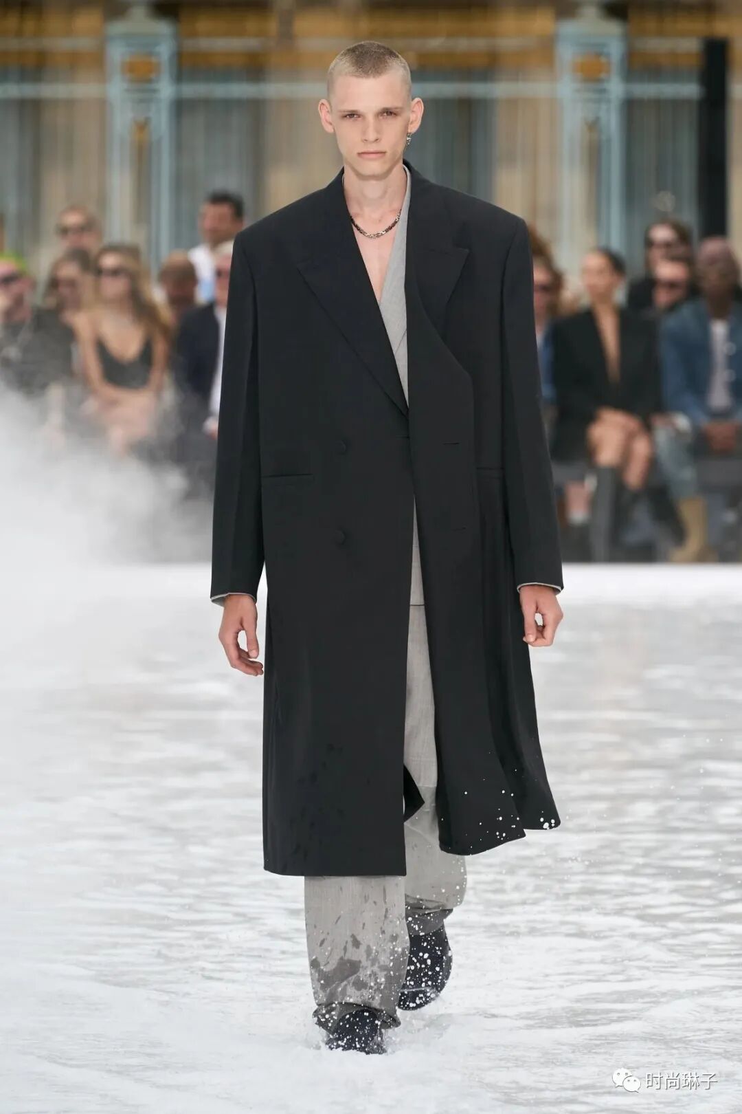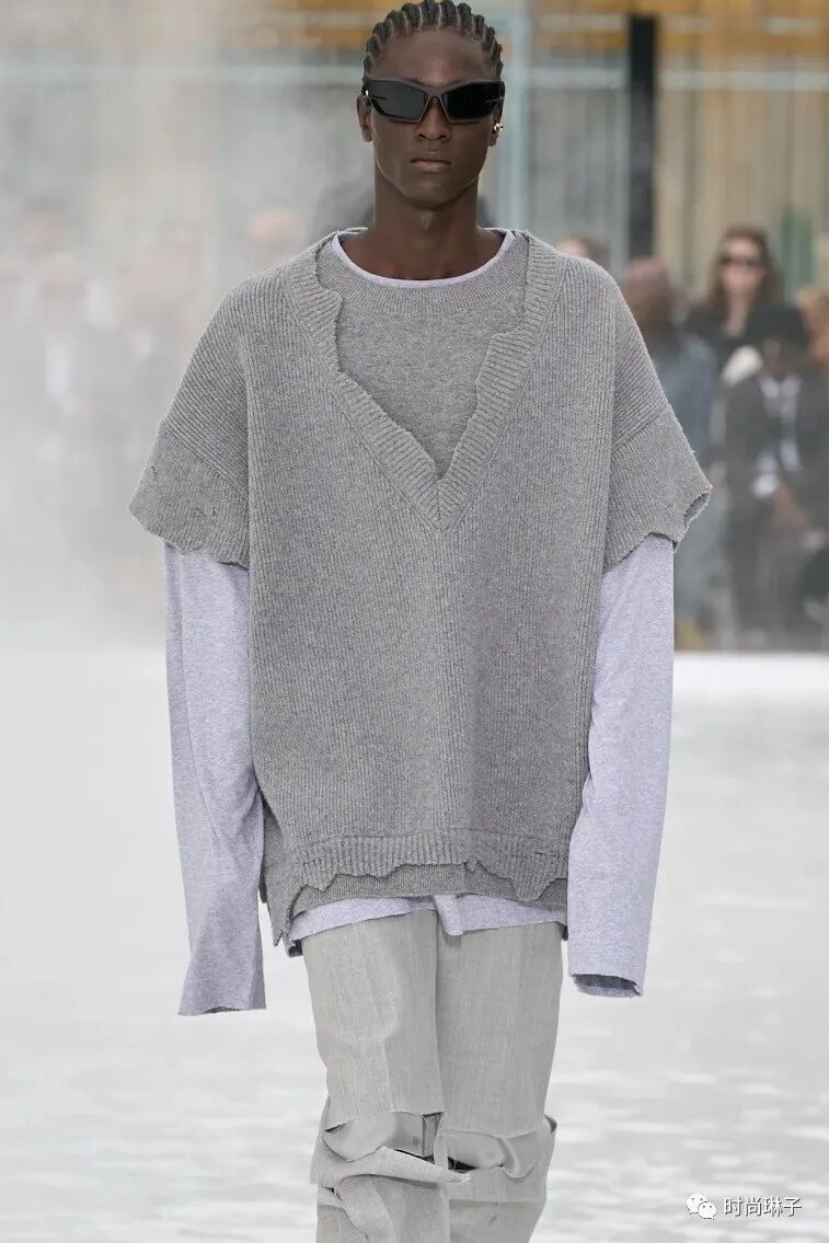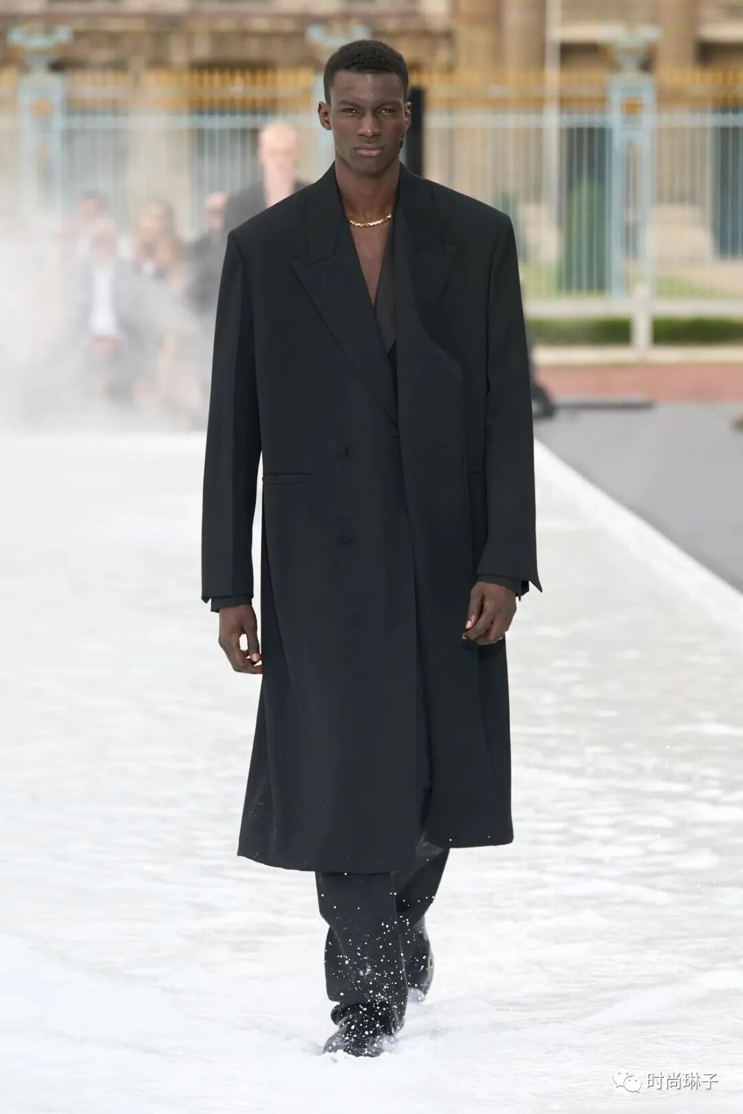 纪梵希Givenchy 2023春夏男装系列中宽松廓形的大衣,西装外套和无袖衬衣精致简约的裁剪,延续了品牌的优雅。搭配膝盖处撕裂的裤装打破常规