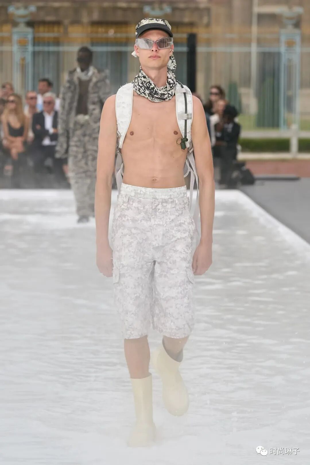 该季纪梵希Givenchy在法国国家军事学院École Militaire搭建了一个纯白色的临时水面秀台,模特在水上行走,为炎热的夏季带来几分清凉,也展现了纪梵希运动鞋,以及雨靴的耐水性。