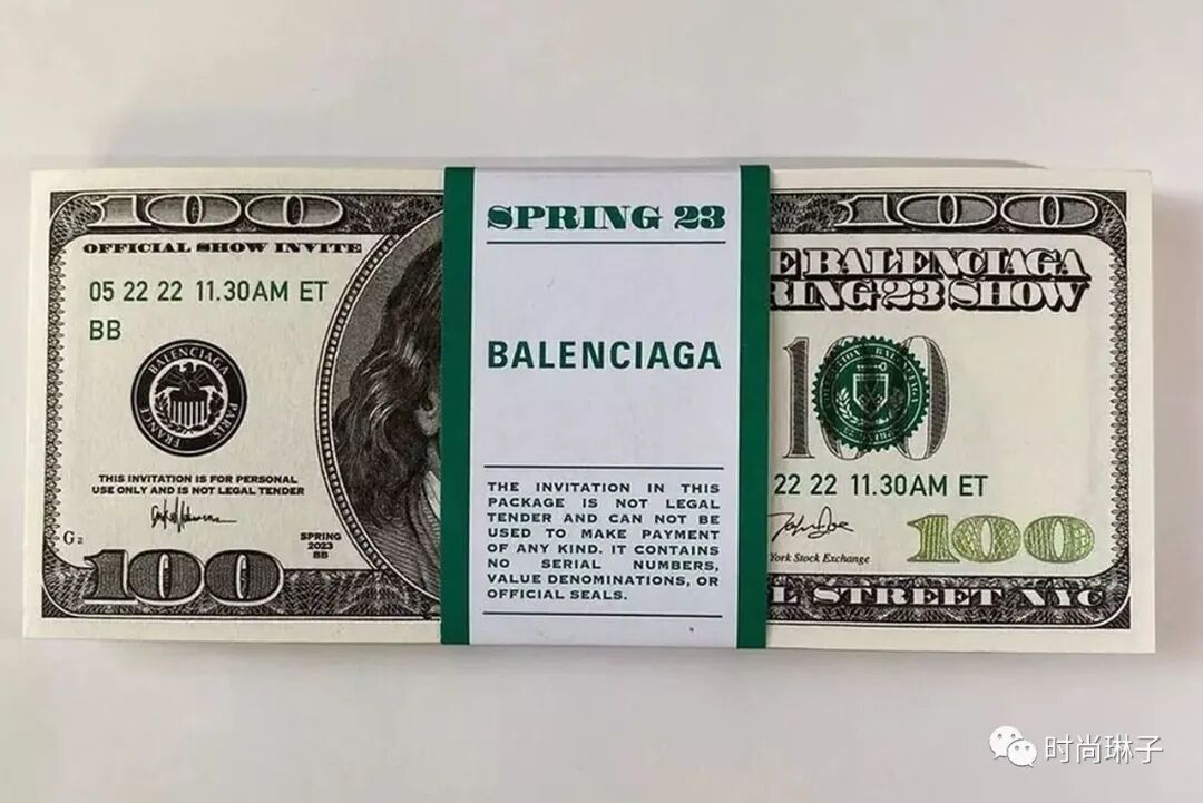 巴黎世家Balenciaga 2023春季时装秀以假的100元钞票为邀请函,呼应纽约证券交易所这个和金钱脱不了关系的时装秀举办地。