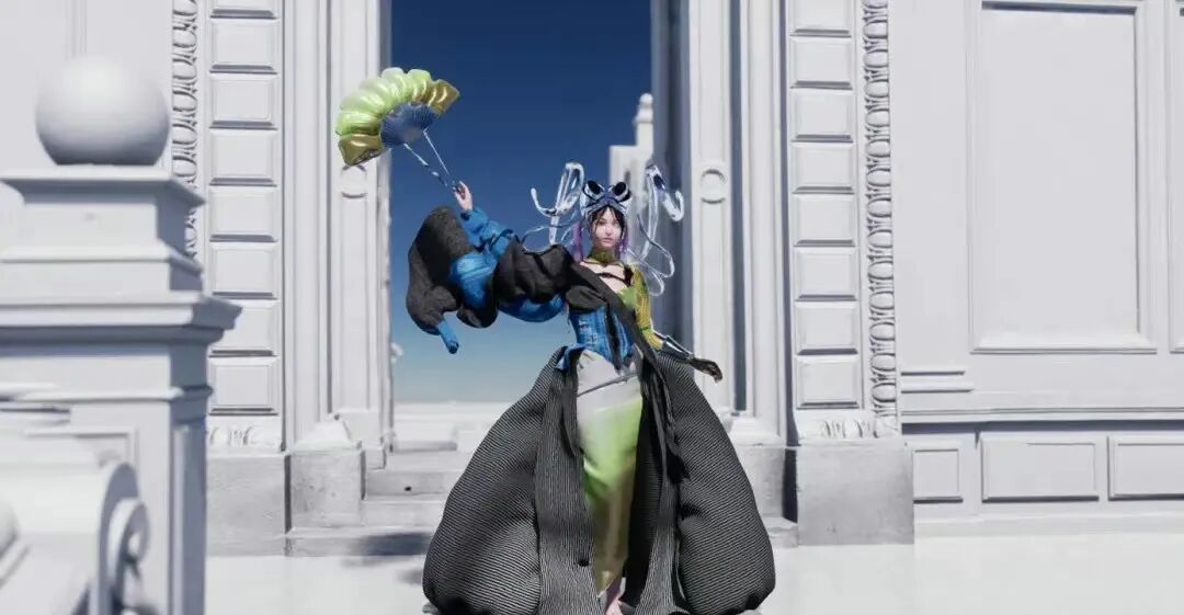 模特身穿新一季成衣,在房间中穿梭,窗外是变换的景观,用元宇宙的概念,突破维度,虚拟与现实、实像与拟像相互交映。