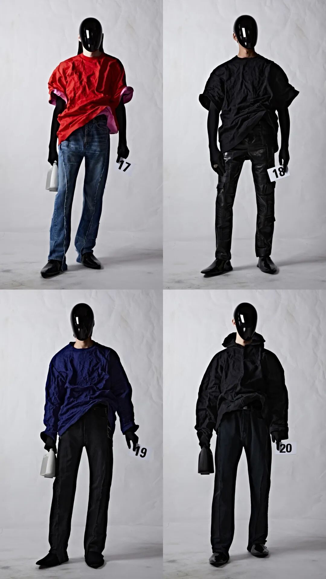 超过四分之一的造型采用升级再造的单品重新构建打造。复古夹克、派克大衣、短外套及牛仔服均被精心解构及重组,将两件服饰打造成一件全新廓形的单品。