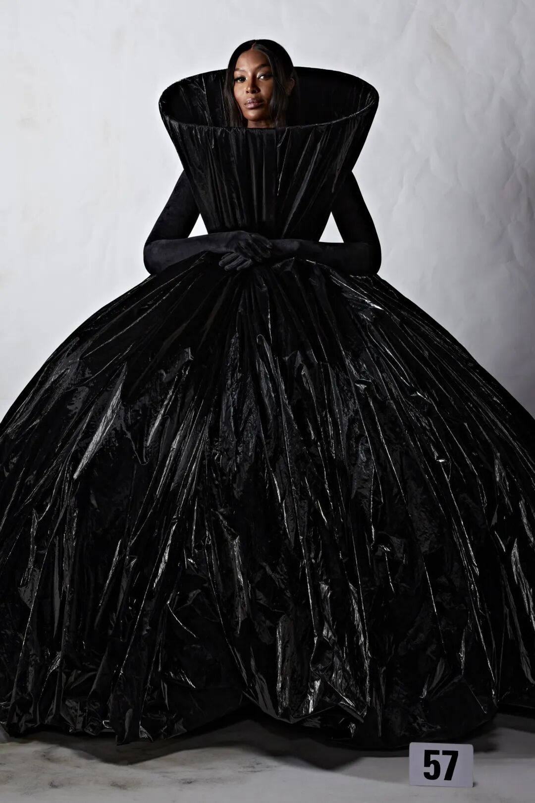 本季系列将日本石灰石基氯丁橡胶潜水面料引入高级定制,化身为现代版的 Gazar —— 一种专门为 Cristóbal Balenciaga 研发的面料。此外,一些造型带有 3D 打印的垫肩, 以及受潜水服启发为灵感的拉链设计。