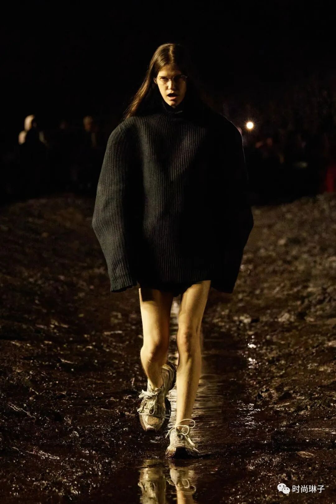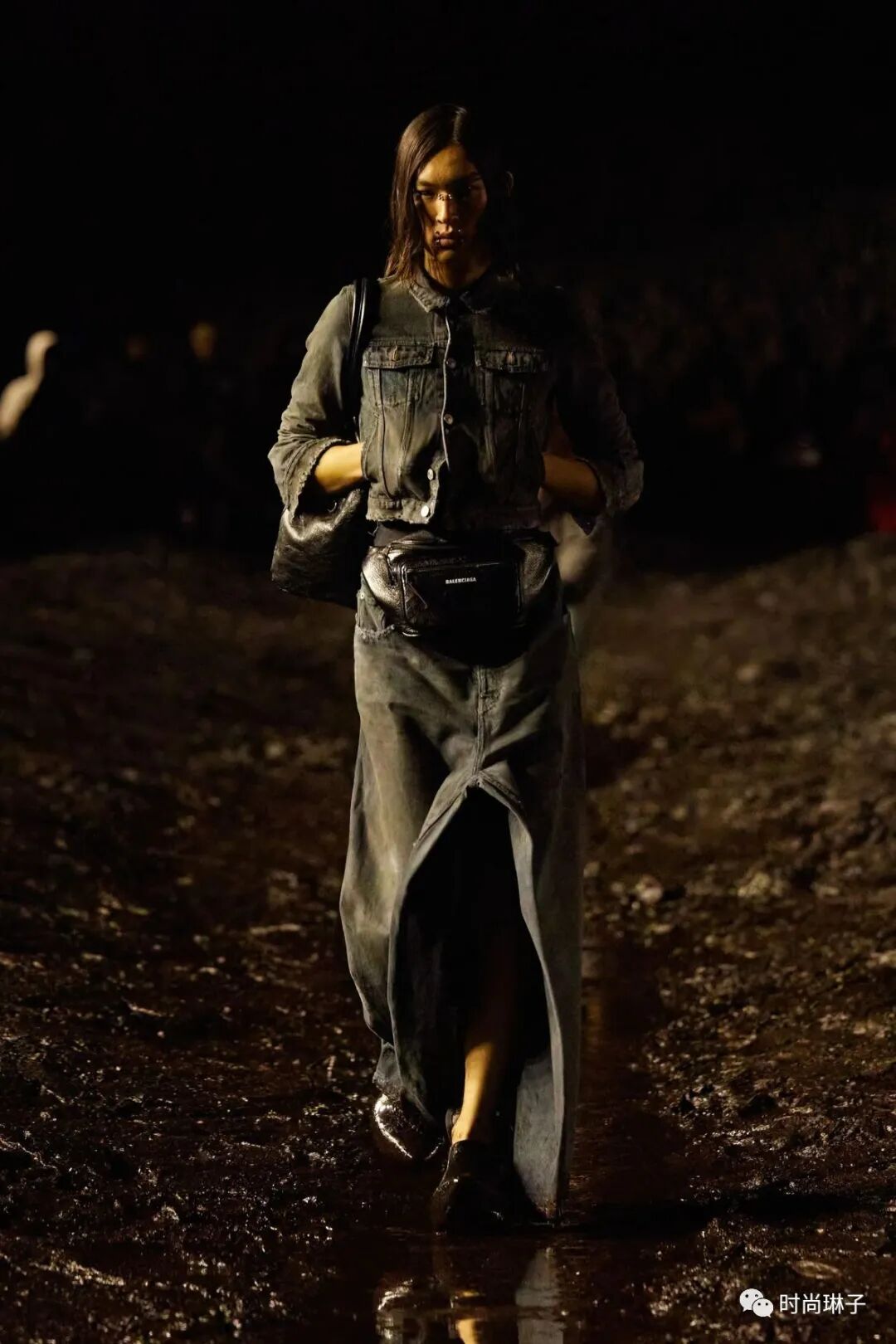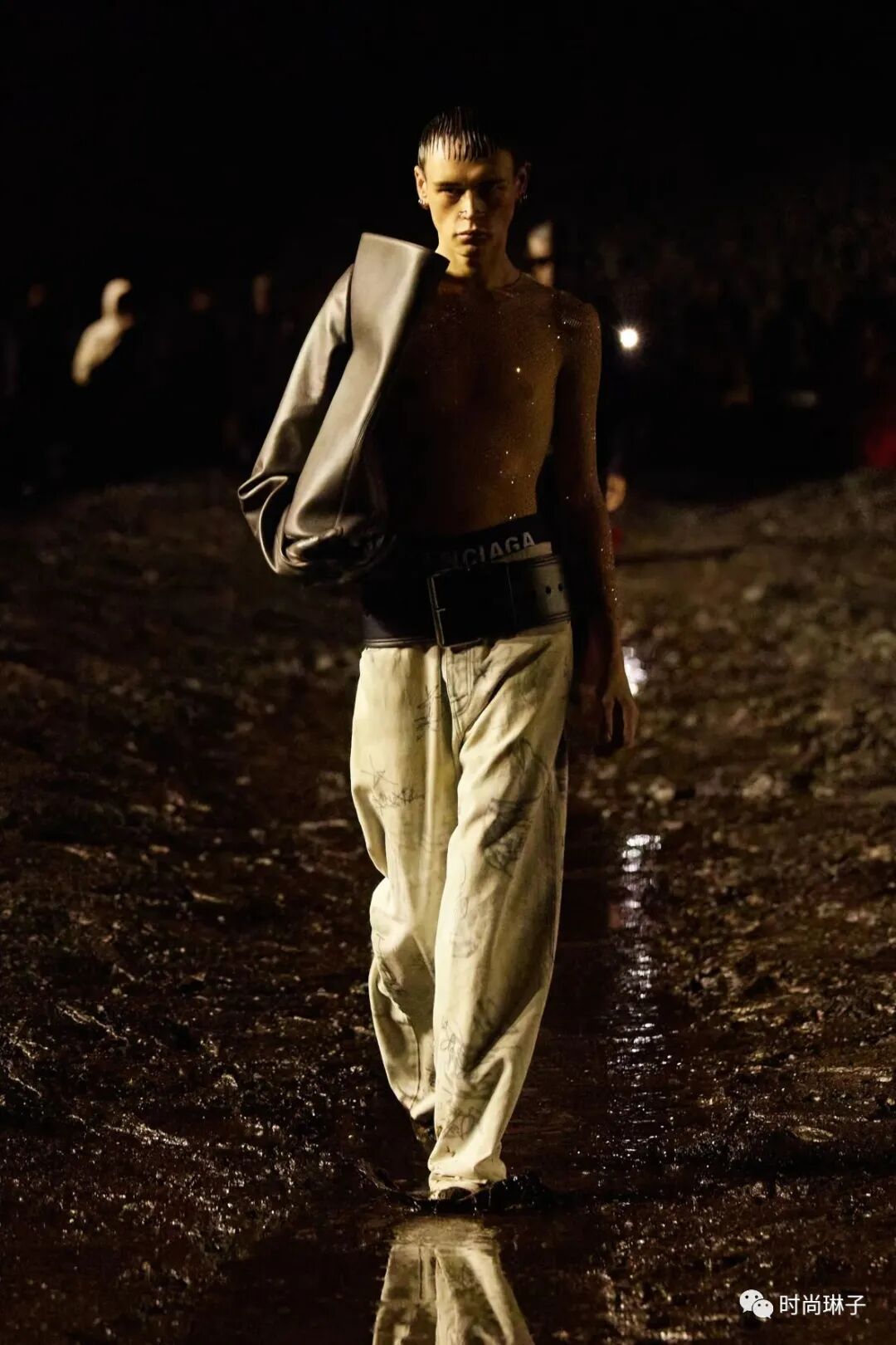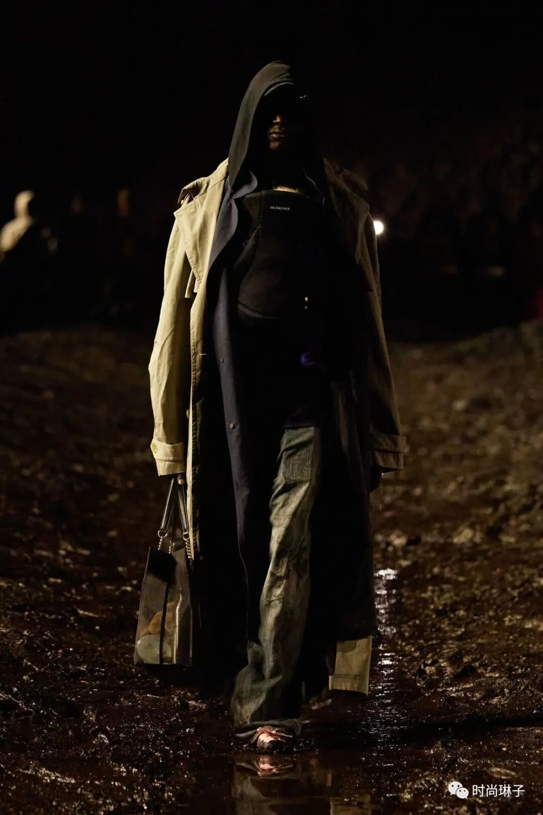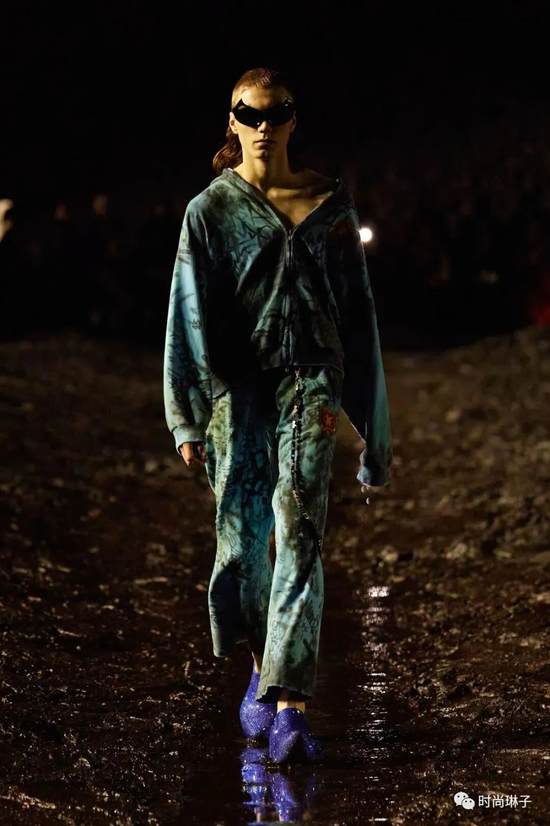 巴黎世家2023夏季大秀秀场以泥泞的路面为T台,被现实打击的“鼻青脸肿”的模特们,穿着夹克、牛仔裤、运动衫、长裙........,依然在生活这条道路上勇往直前。