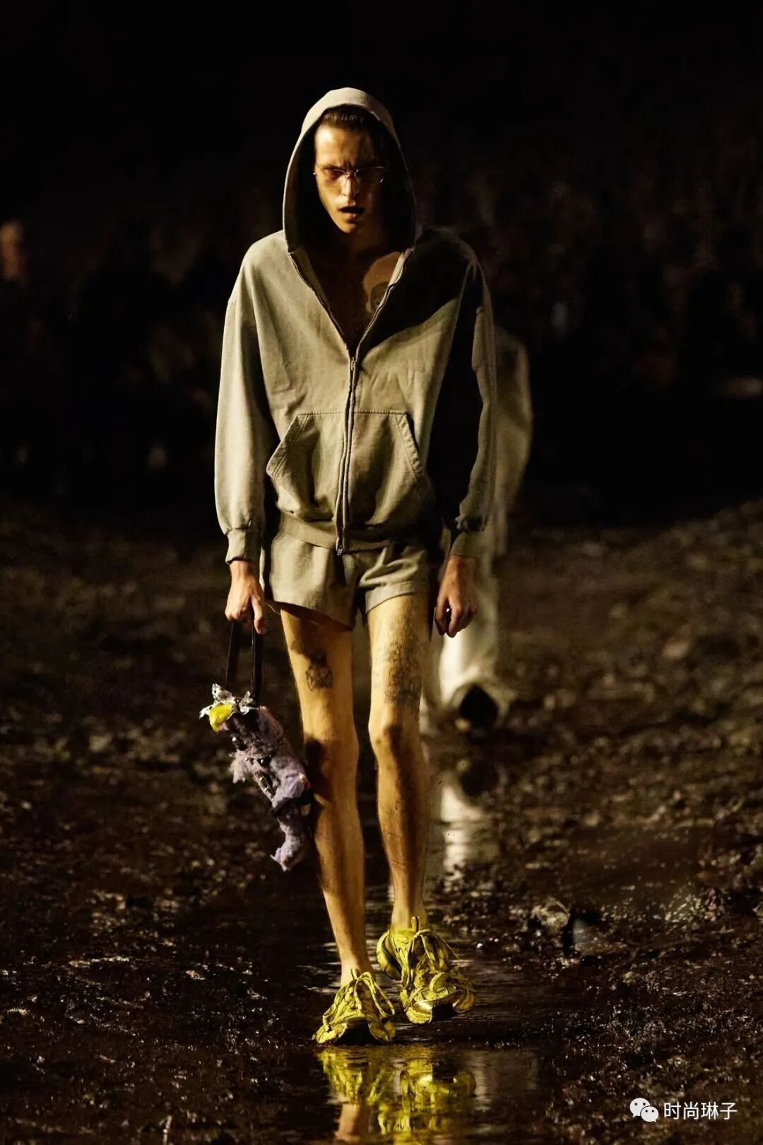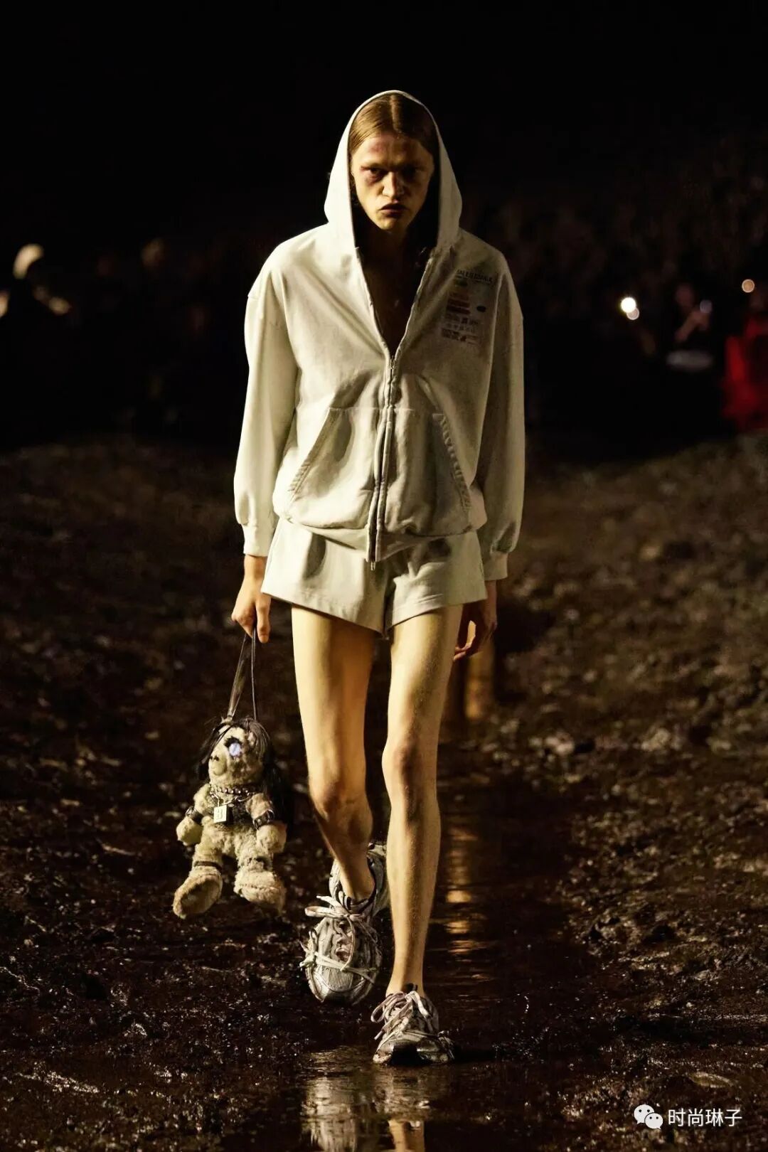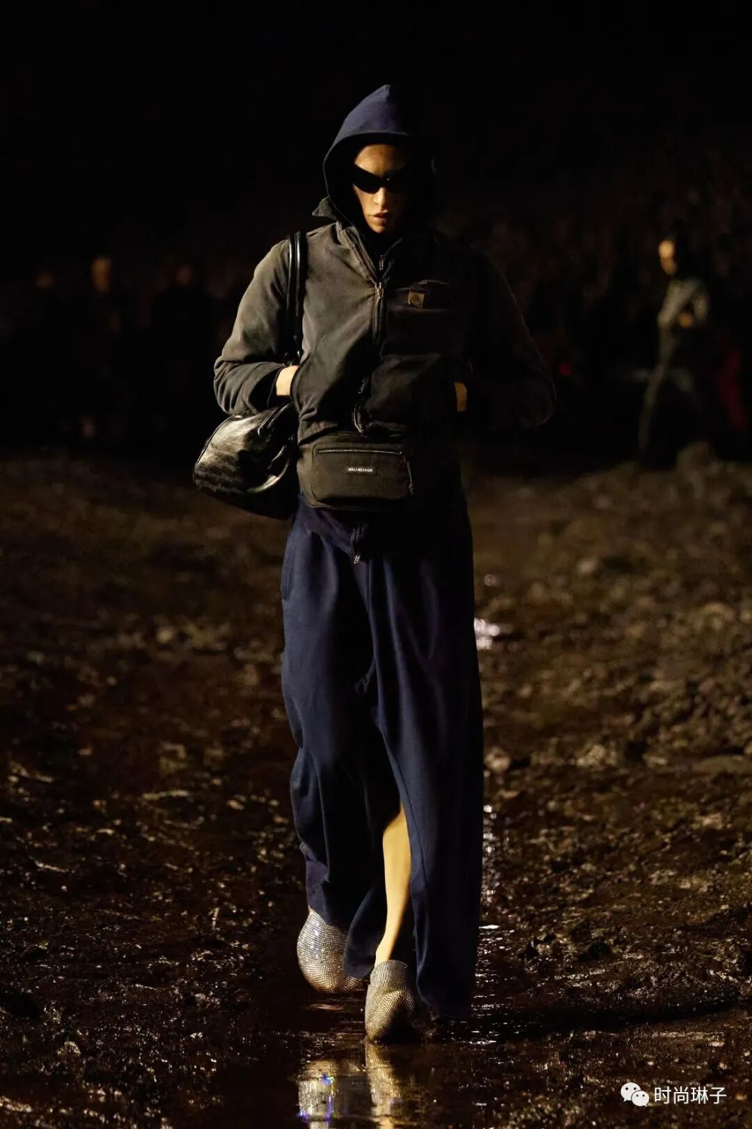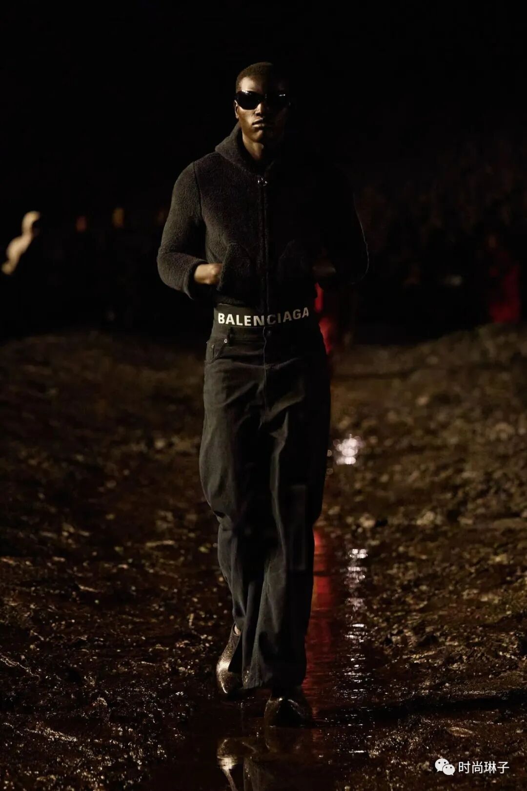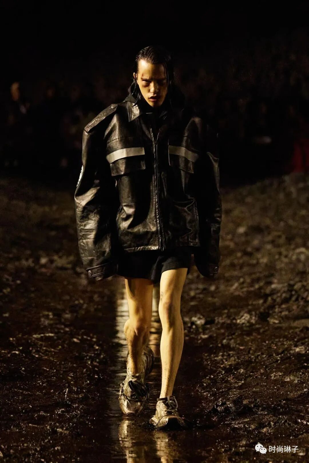 巴黎世家2023夏季大秀秀场以泥泞的路面为T台,被现实打击的“鼻青脸肿”的模特们,穿着夹克、牛仔裤、运动衫、长裙........,依然在生活这条道路上勇往直前。